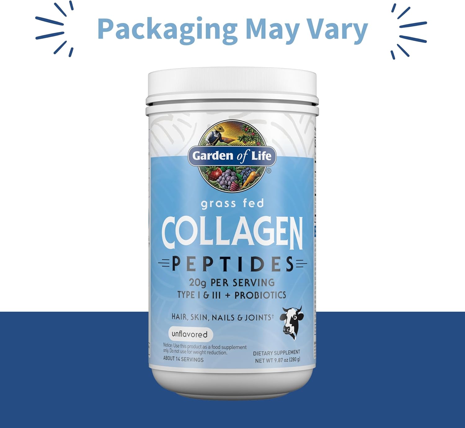 Garden of Life Grass Fed Collagen Peptides Powder offers an unflavored, high-quality supplement ideal for both women and men. This multi collagen peptides powder contains 18g of protein per serving, promoting skin elasticity, strong nails, and healthy hair †. Whether you're aiming to reduce the signs of aging or strengthen your hair, this collagen for hair delivers beneficial nutrients †. Additionally, the collagen protein powder is packed with essential amino acids that support healthy cartilage, joints, ligaments †, and overall joint mobility—making it a great collagen for joints. Our Collagen Peptides are highly bioavailable to the body for maximum benefits. Our colageno powder is enriched with 250 million CFU probiotics, providing excellent gut health and digestion †. The hydrolyzed structure means the collagen peptides are broken down into amino acids, providing optimal absorption. With 20g of easily dissolvable collagen, it’s great for adding to hot or cold liquids like smoothies, coffee, tea, shakes, or even baked recipes. Enjoy it any time of day with a scoop included for convenience. Our products are Proudly Third-Party Non-GMO Tested by iGEN, Certified Gluten Free by NSF and Certified Keto; Made in the USA from foods grown in the USA and other countries; NO antibiotics, hormones, or GMOs, ever! This hydrolyzed collagen powder is a highly bioavailable supplement, helping you get the maximum benefits for your skin, hair, nails, and joints †. Improve your daily nutrition effortlessly by adding our collagen peptides to your diet. †These statements have not been evaluated by the Food and Drug Administration. This product is not intended to diagnose, treat, cure or prevent any disease,PROMOTES SKIN, HAIR, AND NAILS: Hydrolyzed collagen powder with 18g of protein to support skin elasticity, strong nails, & healthy hair; Helps reduce signs of aging with this unflavored collagen powder for women and men,JOINT & MOBILITY SUPPORT: These hydrolyzed collagen peptides feature essential amino acids and BCAAs, vital and primal in supporting and maintaining joints and mobility,SUPPORTS GUT HEALTH & DIGESTION: With 250 million CFU probiotics for digestion and hydrolyzed with enzymes which break the collagen down into its amino acids for best absorption from the digestive tract into the bloodstream,20g EASY TO USE COLLAGEN PEPTIDES: Dissolves quickly in hot or cold liquids, from smoothies and coffee to tea and shakes. Conveniently mix a scoop of unflavored collagen powder in water or almond milk for a nutritional boost any time,CLEAN COLLAGEN PEPTIDE: Third-Party tested to back every claim! Our flavorless Collagen Supplements are sustainably sourced from cows that are pasture raised to a strict standard