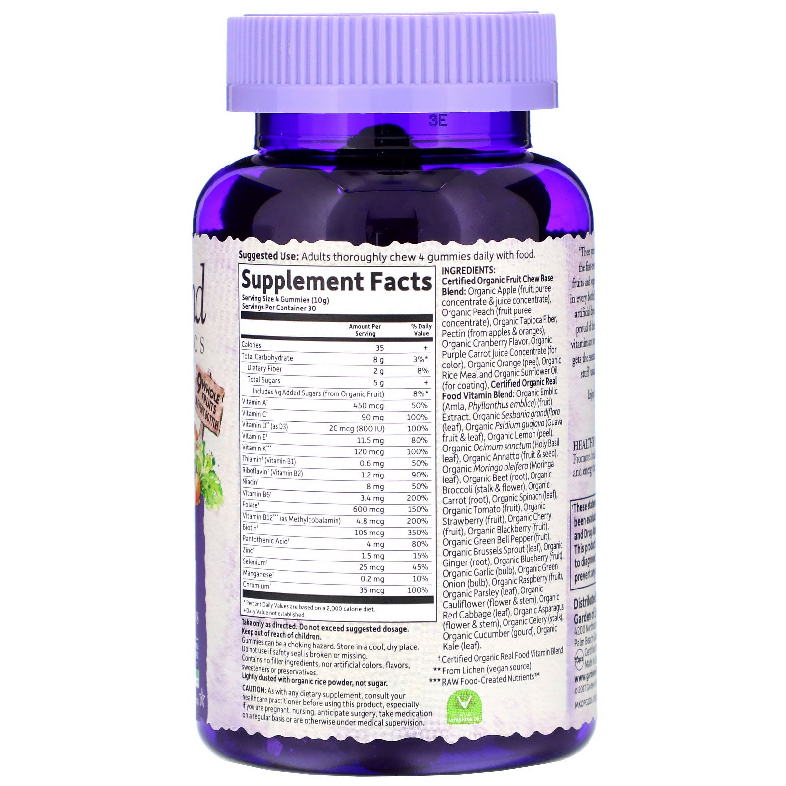 Certified organic fruit chew base blend: Organic apple (fruit, puree concentrate & juice concentrate), organic peach (fruit puree concentrate), organic tapioca fiber, pectin (from apples & oranges), organic cranberry flavor, organic purple carrot juice concentrate (for color), organic orange (peel), organic rice meal and organic sunflower oil (for coating), certified organic real food vitamin blend: organic emblic (amla, phyllanthus emblica) (fruit) extract, organic sesbania grandiflora (leaf), organic psidium guajava (guava fruit & leaf), organic lemon (peel), organic sanctum (holy basil), organic annatto (fruit & seed), organic moringa oleifera (moringa leaf), organic beet (root), organic broccoli (stalk & flower), organic carrot root, organic spinach (leaf), organic tomato (fruit), organic strawberry (fruit), organic cherry (fruit), organic blackberry (fruit), organic green bell pepper (fruit), organic brussels sprout (leaf), organic ginger (root), organic blueberry (fruit), organic garlic (bulb), organic green onion (bulb), organic raspberry (fruit), organic parsley (leaf), organic cauliflower (flower & stem), organic red cabbage (leaf), organic asparagus (flower & stem), organic celery (stalk), organic cucumber (gourd), organic kale (leaf).