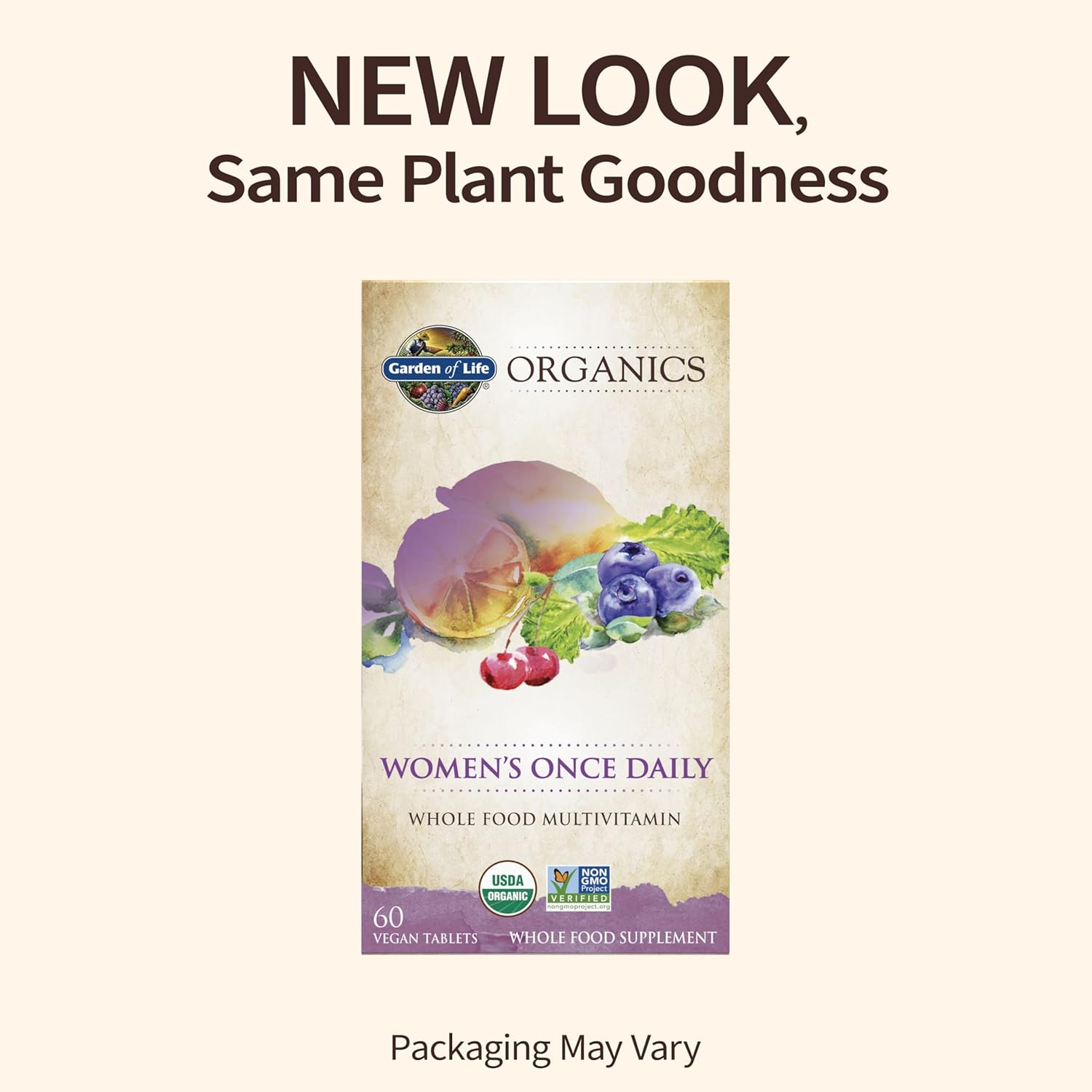 Finally, ItâS HereâA Whole Food Multi From Real, Nutritious Foods ThatâS Certified Usda Organic, Non-Gmo Project Verified And Is Specifically Formulated In A Once-Daily Dose For The Needs Of Women: Garden Of Life Organics WomenâS Once Daily. Made From Over 30 Powdered Organic Fruits, Vegetables And Herbs, Organics WomenâS Once Daily Offers Numerous Vitamins And Including Great Levels Of B Vitamins For Radiant Skin And Nails.â It Also Provides Vitamin B-12 In Methylcobalamin FormâA Highly Absorbable, Active, Natural Form Of B-12, Like The B-12 In The Body.â WomenâS Once Daily Also Delivers Vegan D3 From Lichen For Immune Support And 2.5Mg Of Iron For Blood Support.â WomenâS Once Daily Is Made From Real Organic Whole Food, Including Lemons, Annatto, Amla Berry, Holy Basil And Many MoreâProviding Perfect Support For Your Demanding LifestyleâAll In Just One Organic Tablet Daily.â Garden Of Life Organics WomenâS Once DailyâA Certified Usda Organic, Non-Gmo Project Verified WomenâS Multivitamin Once-Daily Formula Made From Certified Organic Whole Foods, For WomenâS Health, Energy And Beauty.â â These Statements Have Not Been Evaluated By The Food And Drug Administration. This Product Is Not Intended To Diagnose, Treat, Cure Or Prevent Any Disease