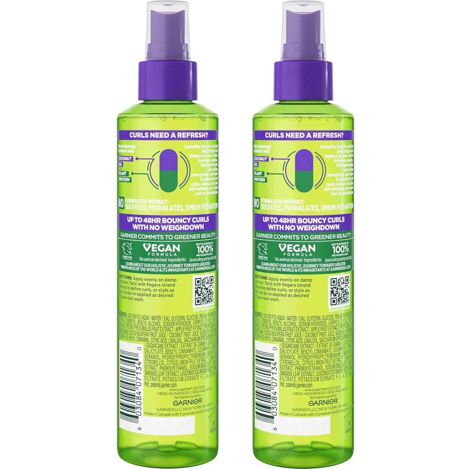 Yes vegan formula. Sulfate-free. Reviving water. Elasto-protein + coconut water. All curl types. Up to 48 Hr moisture & bounce in between washes. Bursting with hydration, Fructis Curl Refresher knocks out frizz and brings back bounce to your curls in between washes. All moisture, no crunch and no weighdown! Suitable for all curls, waves and coils, this lightweight, non-sticky, non-greasy curl water is formulated with exclusive duo of ingredients: coconut water; Elasto-protein, a combination of plant-based protein and conditioning agents. Visible results: curls stay bouncy, shiny and defined. Up to 48 Hr bouncy curls with no weighdwn. No sulfates. No silicones. No parabens. Gentle for everyday use. www.garnierusa.com. Cruelty free. No animal derived ingredients. Garnier commits to greener beauty: more information on garnierusa.com. Eco-Designed Formulas: We track the biodegradability & water footprint of our formulas. Recycled Packaging: Bottle without pump & cap is made of 100% recycled plastic. Renewable Energy: Produced in a plant powered by no less than 45% renewable energy. Approved by cruelty free international. Made in Canada with Canadian and imported parts,Vegan,Cruelty Free/Not Tested on Animals,Sulfate Free