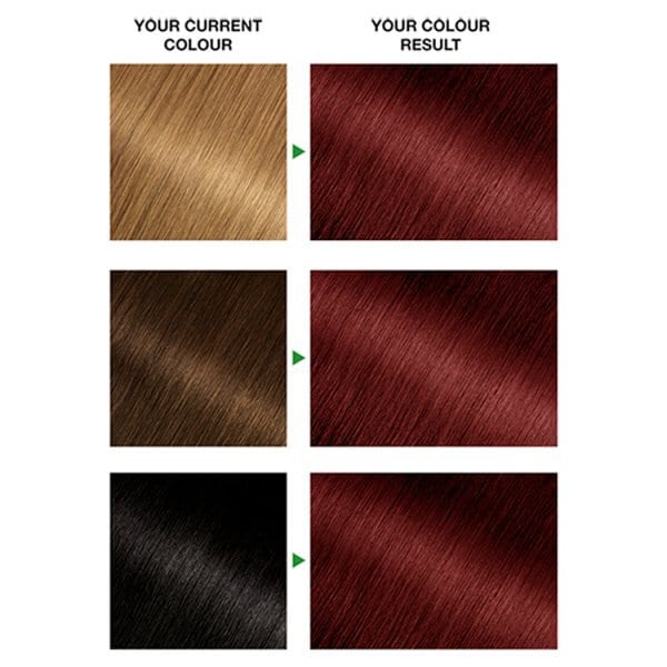 Garnier Nutrisse Crème Permanent Hair Colour features: Shade 4.6 Deep Red Hair Colour Permanent hair dye Up to 100% grey hair coverage Natural-looking hair colour result Rich and long lasting hair colour performance Intensely nourishes and protects against hair dryness for up to 8 weeks After Colour Conditioner enriched with 4 oils for silky, shiny hair Stronger hair, less breakage* (*Instrumental test. Hair breakage from brushing.)