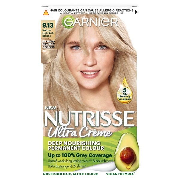 Garnier Nutrisse Crème Permanent Hair Colour features: Shade 9.13 Light Ash Blonde Hair Colour Permanent hair dye Up to 100% grey hair coverage Natural-looking hair colour result Rich and long lasting hair colour performance Intensely nourishes and protects against hair dryness for up to 8 weeks After Colour Conditioner enriched with 4 oils for silky, shiny hair Stronger hair, less breakage* (*Instrumental test. Hair breakage from brushing.) One of our Nutrisse Crème Pearly Blonde shades. A delicate, multi-tonal subtle blonde shade, specifically developed to create a beautiful shimmering blonde hair colour