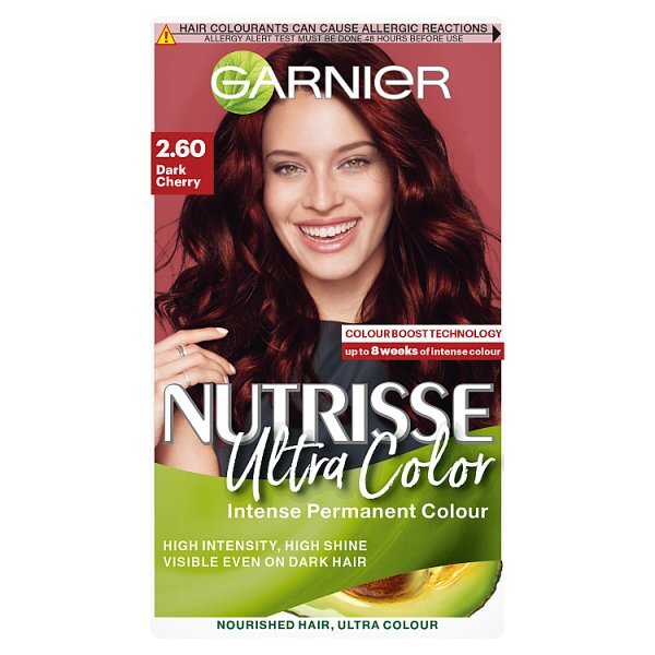 Garnier Nutrisse Ultra Color Permanent Hair Colour features: Shade 2.6 Dark Cherry Hair Colour Permanent hair dye Up to 100% grey hair coverage Natural-looking hair colour result Rich and long lasting hair colour performance Intensely nourishes and protects against hair dryness for up to 8 weeks After Colour Conditioner enriched with 4 oils for silky, shiny hair Stronger hair, less breakage* (*Instrumental test. Hair breakage from brushing.)