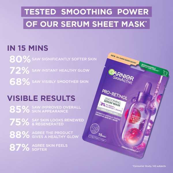 Garnier SkinActive Pro-retinol Smoothing Serum Sheet Mask. Infused with the quantity of 1/2 serum to reduce fine lines in 1 Mask