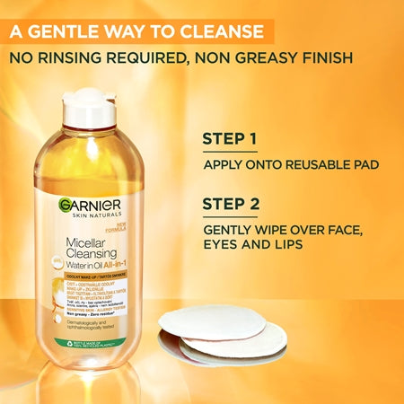 Complexion Type:All Skin Types Make-Up Removal, Cleansing And Nutrition In One Step? That'S The Two-Phase Garnier Skin Naturals 3-In-1 Micellar Water, Which Combines Oil With Micellar Technology. The Micelles Bind To All The Dirt Like A Magnet, Whilst The Oil Part Removes All Types Of Makeup, Including Waterproof Makeup. Your Skin Is Left Soft And Nourished After Use. Characteristics: For Easy Cleaning And Makeup Removal Without Needing To Scrub Removes All Types Of Makeup, Including Long-Lasting And Waterproof Eliminates All Dirt From Your Skin No Need To Rinse Off Leaves The Skin Nourished Suitable For Removing Eye Makeup Ingredients: Micellar Water – Contains Micelles Which Bind Dirt To Them How To Use: Shake Well Before Use So That Both Layers Combine. Then Apply The Water To A Piece Of Cotton Wool And Use Gentle Strokes To Remove Makeup Or Cleanse Your Face Other Information:Manufacturer/Importer: Garnier 14, Rue Royale 75008 Paris France Garnier@It.Oaccare.Com About The Brand:Class Garnier Garnier Products Have Been Having An Impact On The Lives Of Men And Women Around The World For More Than A Century. Founded In France, It Gradually Became One Of The Best-Known Cosmetic Brands. The Story Began In 1904, When Alfred Amour Garnier Developed The First Plant Toner For Hair Beauty, Which Soon Became A Bestseller. In 1960, The First Garnier Hair Colour Was Created For Home Use, Leading Women To Start Viewing Their Hair As A Fashion Accessory. Other Products That Gained Instant Popularity Include Garnier Micellar Water And Garnier Pure Active Cleansing Gel. The Garnier Brand Has Always Listened To Its Customers And Reflected Their Needs In Its Skin Care And Hair Care Ranges. It Creates Products That Are Truly Effective And Readily Available And Make Everyday Rituals In Beauty Care Simpler. It Is Because Of This That Garnier Has Become So Successful And Can Now Be Found In Over 120 Countries All Over The World Ingredients:Ingredients Garnier Skin Naturals Complete Ingredients List Aqua, Cyclopentasiloxane, Isohexadecane, Argania Spinosa Oil/Argania Spinosa Kernel Oil, Benzyl Alcohol, Benzyl Salicylate, Butyl Methoxydibenzoylmethane, Ci 60725/Violet 2, Decyl Glucoside, Dipotassium Phosphate, Disodium Edta, Ethylhexyl Methoxycinnamate, Ethylhexyl Salicylate, Geraniol, Haematococcus Pluvialis/ Haematococcus Pluvialis Extract, Hexylene Glycol, Limonene, Linalool, Pentaerythrityl Tetra-Di-T-Butyl Hydroxyhydrocinnamate, Polyaminopropyl Biguanide, Potassium Phosphate, Sodium Chloride, Parfum/Fragrance (F.I.L. B176670/1). The Manufacturer Is Responsible For The Ingredients Of The Product. We Recommend Checking The List Of Product Ingredients Directly On Its Packaging Due To Potential Changes