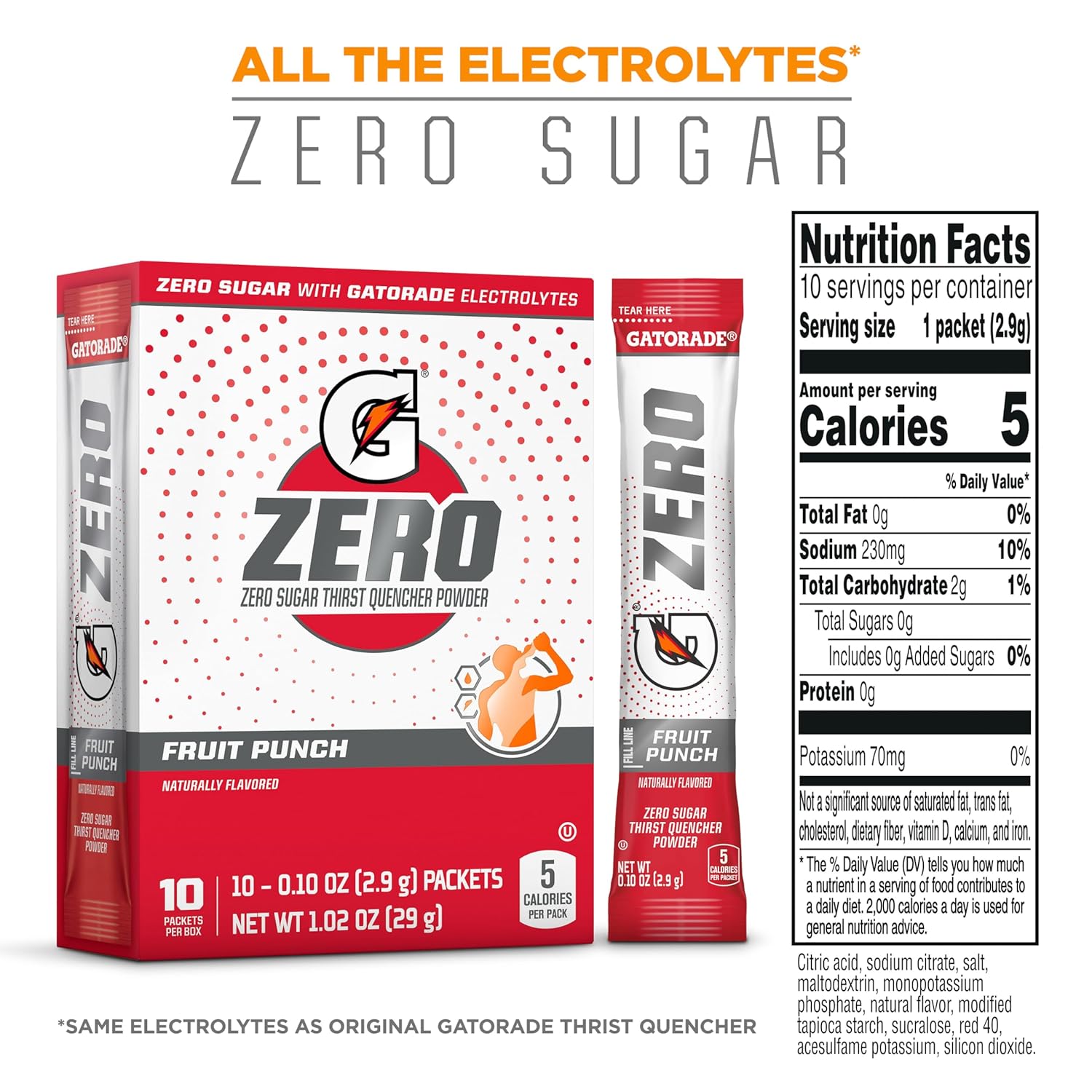 Includes 120 (0.10Oz) Individual Packets Of Gatorade G Zero Powder, Fruit Punch Flavor. Each Packet Makes 20Oz Of Gatorade G Zero