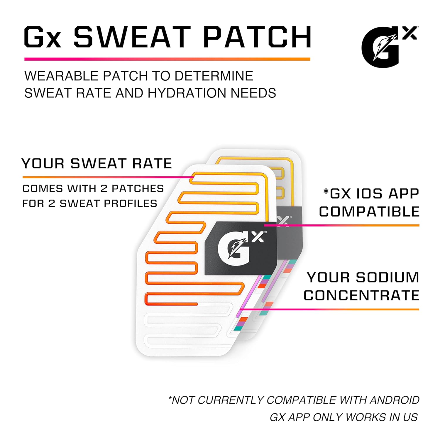 Includes 2 Gatorade GX Sweat Patch Single Use Sweat TestsMeasure sweat rate, fluid loss, and sodium lossUses non-toxic food dyes for measurementApply patch to clean and dry inner-left forearmCertified hypoallergenic adhesiveSweat Patch