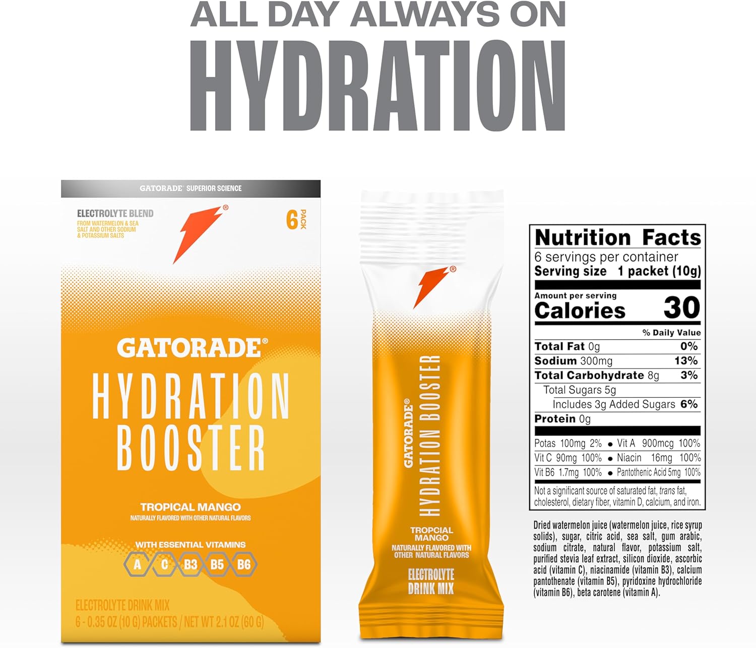 Includes 6 (0.35 Oz) Gatorade Hydration Booster Electrolyte Drink Mix Sachets, Tropical Mango Flavor