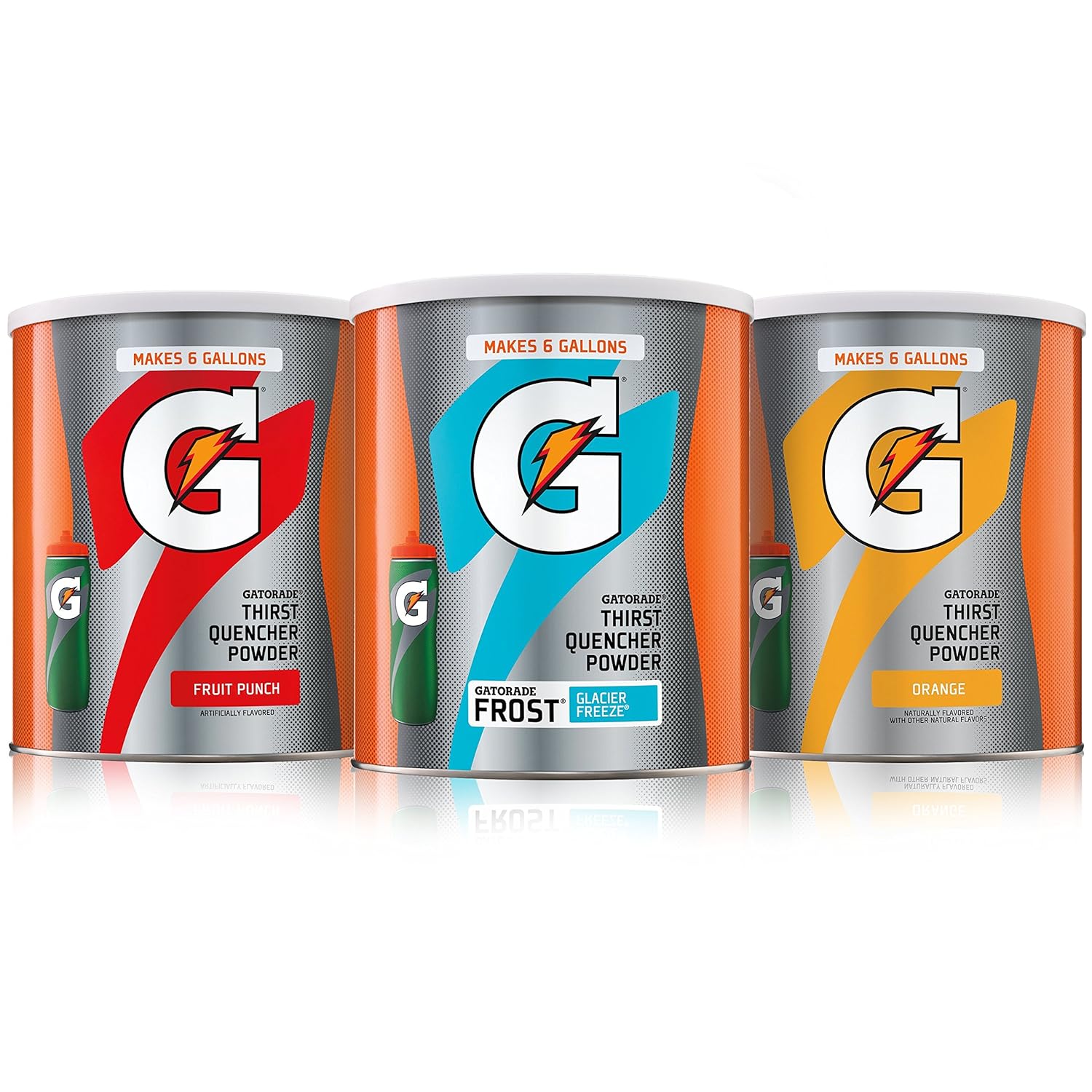With A Legacy Over 50 Years In The Making, ItâS The Most Scientifically Researched And Game-Tested Way To Replace Electrolytes Lost In Sweat. Gatorade Hydrates Better Than Water, Which Is Why ItâS Trusted By Some Of The WorldâS Best Athletes. This New Variety Pack Includes Three 51 Ounce Canisters Of Gatorade Thirst Quencher Instant Powder Mix, Each Yielding 6 Gallons. Flavors Include Fruit Punch, Orange, And Glacier Freeze (One Canister Each)