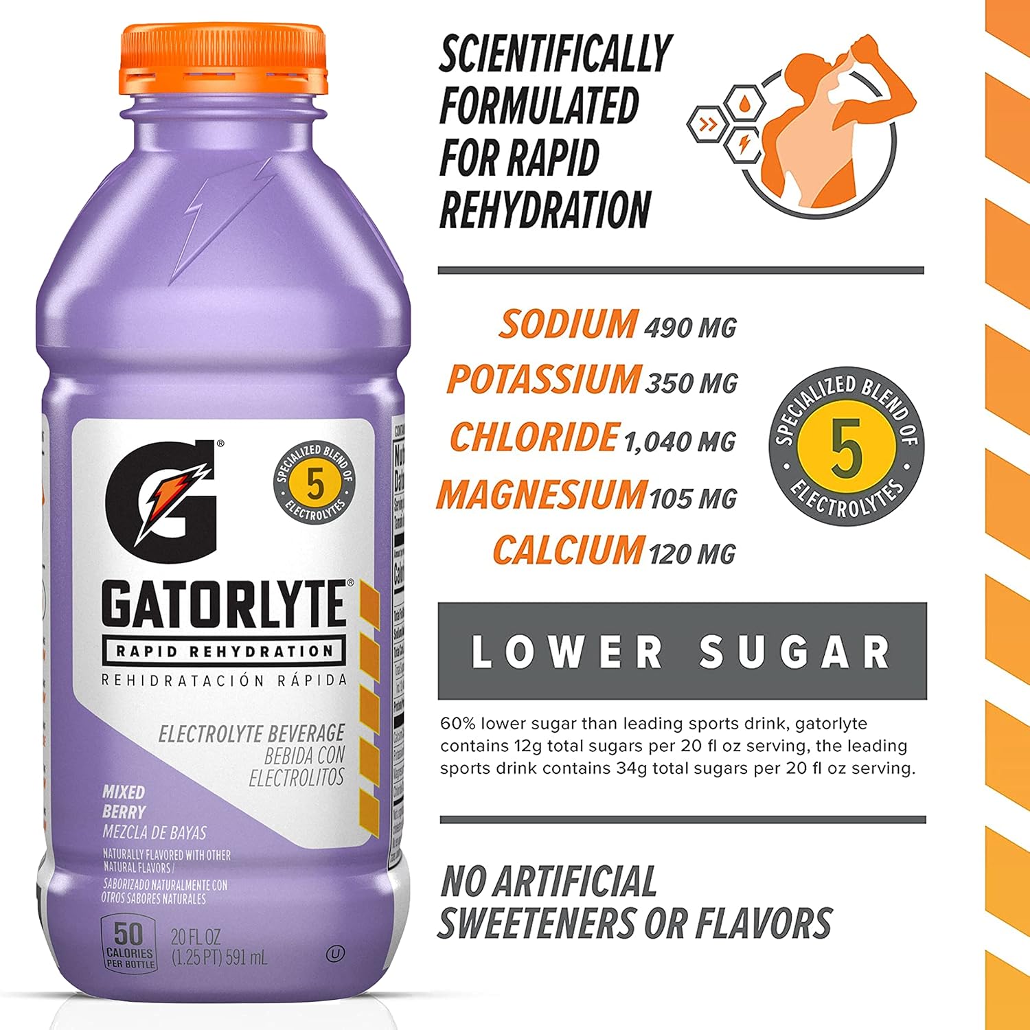 Gatolyte Rapid Rehydration Electrolyte Beverage Is Scientifically Formulated For Rapid Hydration. Made With A Specialized Blend Of 5 Electrolytes And No Artificial Sweeteners Or Flavors. Made With 60% Lower Sugar Than Leading Sports Drink, Gatorlyte Contains 12G Total Sugars Per 20 Fl Oz Serving, The Leading Sports Drink Contains 34G Total Sugars Per 20 Fl Oz Serving