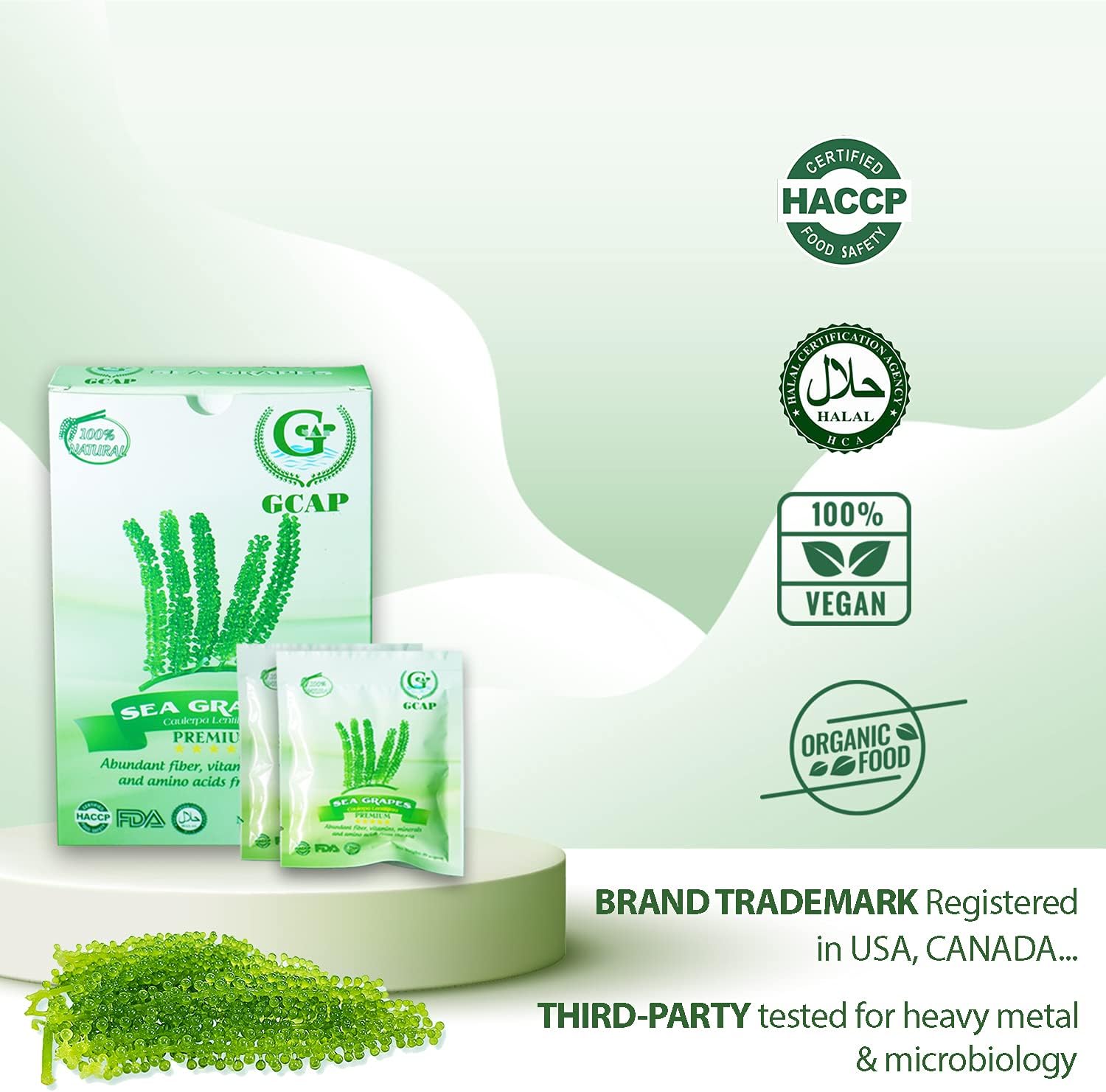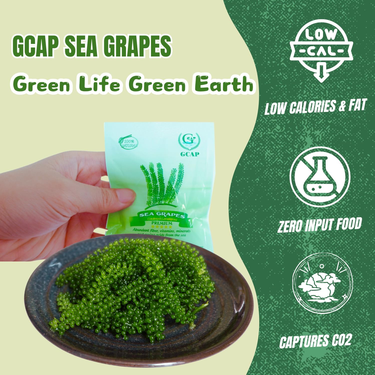 About this item ?SEA GRAPES (Umibudo or also known as green caviar) is an extremely nutritious seaweed, abundant vitamins, minerals, and amino acids from the sea. ?HIGH QUALITY, HIGH NUTRITION: Our natural sea grapes no artificial colors, organic, vegan, ensuring that you get only the most natural, healthiest seaweed possible. ?VERIFIED ORIGIN: 100% natural sea grapes: Introduced from Okinawa and cultured using Japanese Technology, our top-grade Sea Grapes are farmed and harvested from the GCAP' farm which is located in natural clean coastal areas of Khanh Hoa, Vietnam. Fully dehydrated sea grapes in brine. ?TIME-SAVING & EASY FOR PREPARING: 120 grams salted sea grapes bloom 360g worth of sea grapes after soaking in water. The sea grapes is eaten fresh like green vegetable with any sauce (seafood sauce, soy sauce, wasabi…), salad dressing, sushi and sashimi ingredients or simply as a snack ?HEALTHY for everyone, Enhance Health, Boosting Immune System, especially good for the elderly and children. › See more product details,?SEA GRAPES (Umibudo or also known as green caviar) is an extremely nutritious seaweed, abundant vitamins, minerals, and amino acids from the sea,?HIGH QUALITY, HIGH NUTRITION: Our natural sea grapes no artificial colors, organic, vegan, ensuring that you get only the most natural, healthiest seaweed possible,?VERIFIED ORIGIN: 100% natural sea grapes: Introduced from Okinawa and cultured using Japanese Technology, our top-grade Sea Grapes are farmed and harvested from the GCAP' farm which is located in natural clean coastal areas of Khanh Hoa, Vietnam. Fully dehydrated sea grapes in brine,?TIME-SAVING & EASY FOR PREPARING: 120 grams salted sea grapes bloom 360g worth of sea grapes after soaking in water. The sea grapes is eaten fresh like green vegetable with any sauce (seafood sauce, soy sauce, wasabi…), salad dressing, sushi and sashimi ingredients or simply as a snack,?HEALTHY for everyone, Enhance Health, Boosting Immune System, especially good for the elderly and children