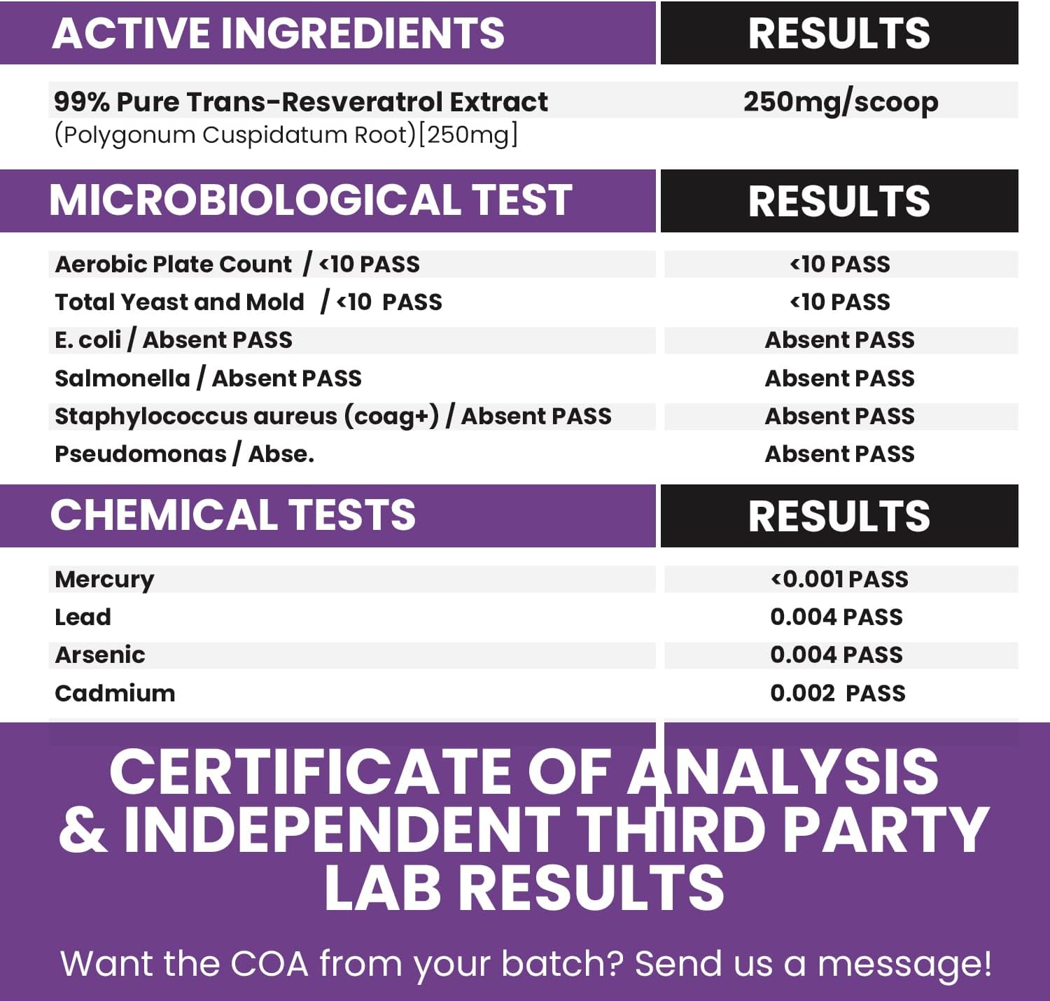 99% PURE - At Genex, our Resveratrol is 99% pure, pharmaceutical grade Trans-Resveratrol powder. It is a powerful free-radicals scavenger supporting brain function, and healthy aging