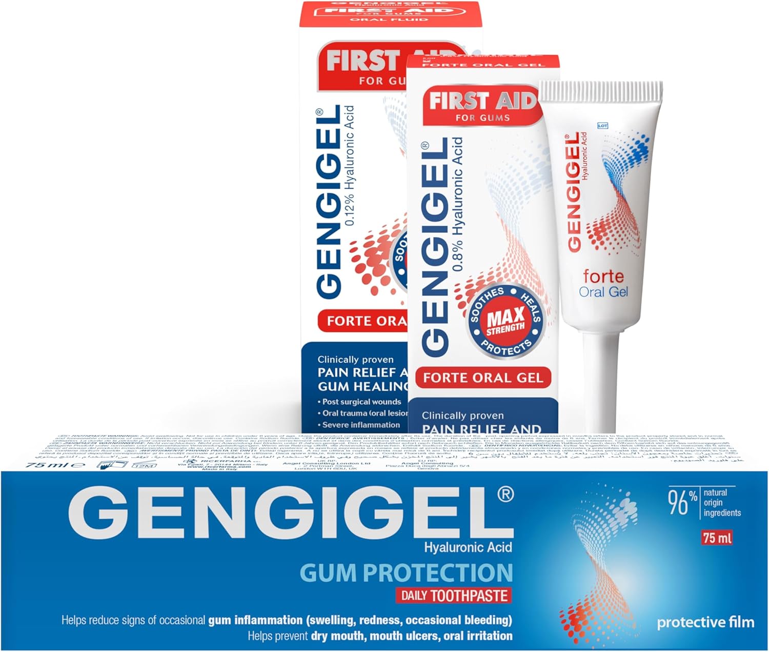 About The Product : A special Gengigel bundle - contains 1x Gengigel 75ml Toothpaste, 1x Gengigel First Aid Oral Fluid 50ml, 1x Gengigel First Aid Forte Oral Gel 8ml and a Gingival Toothbrush