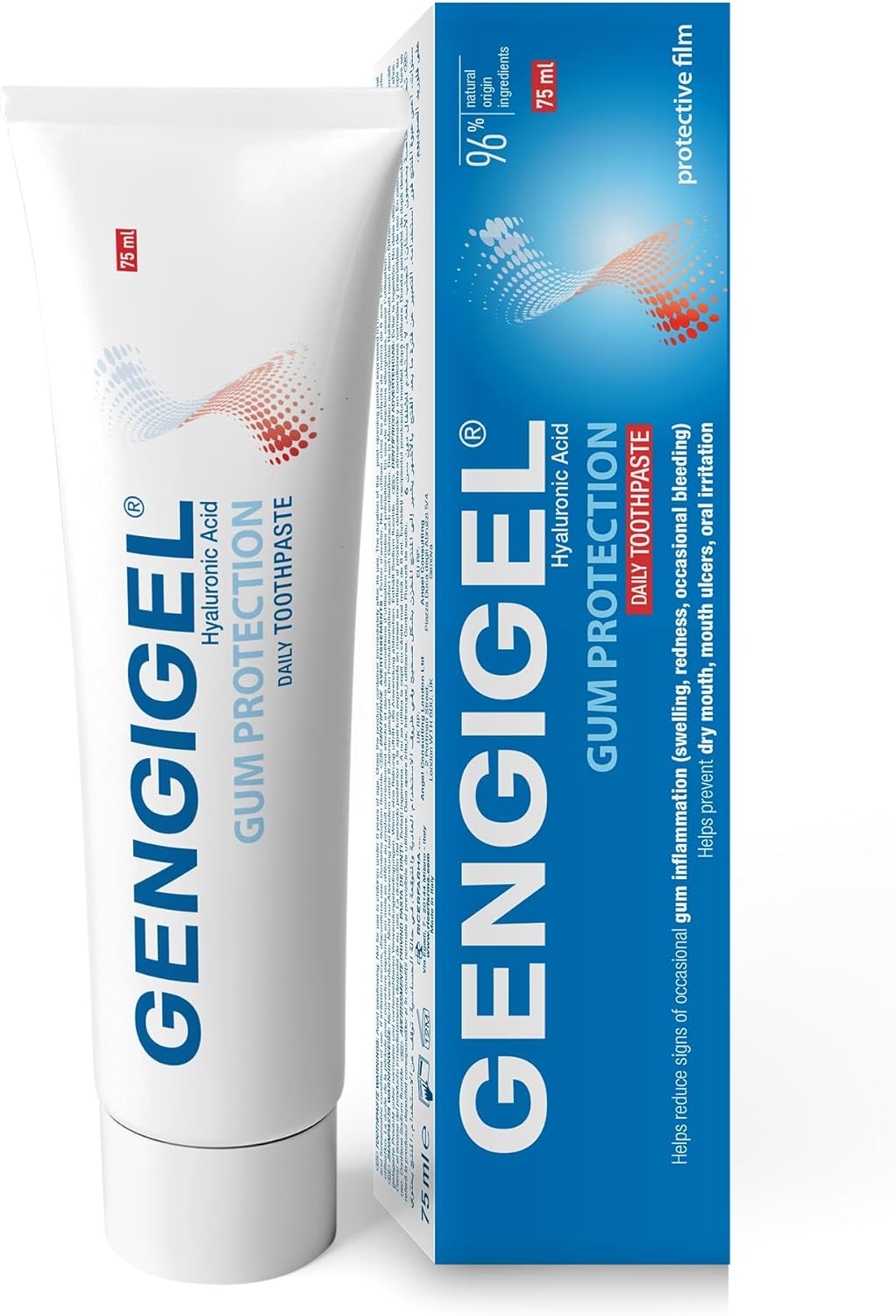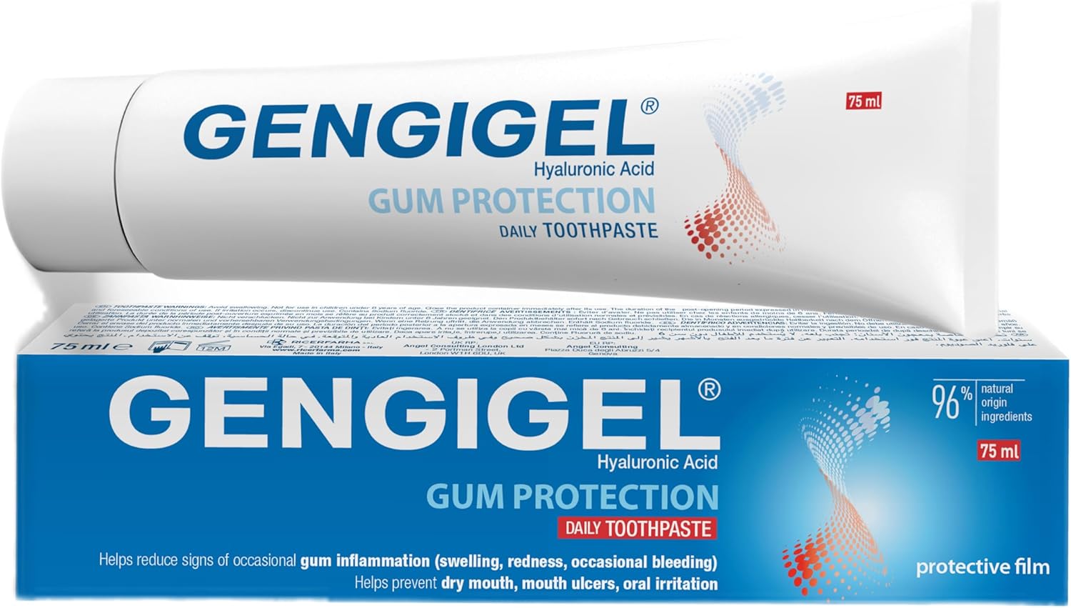 Product Description Helps reduce signs of occasional gum inflammation (swelling, redness, occasional bleeding). Helps prevent dry mouth, mouth ulcers, oral irritation. Its composition is characterised by the presence of high-molecular-weight hyaluronic acid, which is similar to the hyaluronic acid naturally present in the oral mucosa. Under normal conditions, high-molecular-weight hyaluronic acid is particularly concentrated in the outermost layers of healthy gum tissue, where it contributes to the barrier function. In periodontal disease and other tissue lesions (inflammatory conditions, gingival pockets and sores), the tissue requirement of hyaluronic acid increases considerably (by up to 200% above the baseline values), demonstrating its role in keeping gums healthy. Its formulation, 96% of which consists of ingredients of natural origin, contains: - Hyaluronic acid, which restores and protects gum tissue in the case of gingivitis, periodontal disease, irritation and occasional bleeding. The hyaluronic acid contained in the toothpaste reduces discomfort by forming a long-lasting protective film on the gums, due to a patented mucoadhesive complex. - Lactoferrin, which protects the oral mucosa against the bacteria responsible for the development of tooth decay. - Aloe vera extract, betaine and bisabolol, which perform a soothing action. - Fluoride, which helps strengthen and protect tooth enamel. - Xylitol, which aids the normal salivation process and makes the product suitable for use even in a dry mouth. - A mint-lemon flavoured toothpaste for fresh breath. Low foam formation, enabling the protective film to remain in place for a long time. Gengigel toothpaste has a very low abrasive effect on both dentine and enamel, ensuring gentle action on teeth and gums. Directions for use: use daily, 2 to 3 times a day, after main meals, applying with a soft toothbrush. Gengigel toothpaste can be used in conjunction with other Gengigel products, for optimal results. Ingredients Aqua, Hydrogenated starch hydrolysate, Hydrated silica, Xylitol, Sodium, chloride, Lauryl Glucoside,Xanthan gum. Glycerin, PVM/MA Copolymer, Sodium carbonate, Betaine, Tetrasodium pyrophosphate,Prunus amygdalus dulcis oil, Aloe barbadensis Leaf Juice, Sodium Hyaluronate, Bisabolol,Carboxymethyl Chitosan, Lactoferrin, Sodium fluoride, Ascorbyl Palmitate, Tocopheryl Acetate,Hydroxyacetophenone, 1,2-Hexanediol, Capryl Glycol, Glycerophosphocholine, Sodium saccharin,Disodium EDTA, Potassium Sorbate, Sodium Benzoate, Benzyl Alcohol, Titanium dioxide, Aroma Contains Sodium fluoride (0,32% w/w equivalent to 1.450 ppm of Fluoride P.when('A').execute(function(A) { A.on('a:expander:toggle_description:toggle:collapse', function(data) { window.scroll(0, data.expander.$expander[0].offsetTop-100); }); }); Directions Use daily 2 to 3 times a day after main meals. Can be used in conjunction with other Gengigel products for optimal results. Safety Warning For external use. Do not swallow. Keep out of reach of children. If irritated, stop using and consult the dentist. See more,Helps prevent dry mouth, mouth ulcers, oral irritation,Helps reduce signs of occasional gum inflammation (swelling, redness, occasional bleeding),A mint-lemon flavoured toothpaste for fresh breath,Use daily, 2 to 3 times a day, after main meals. Can be used in conjunction with other Gengigel products, for optimal results,The hyaluronic acid contained in the toothpaste reduces discomfort by forming a long-lasting protective film on the gums