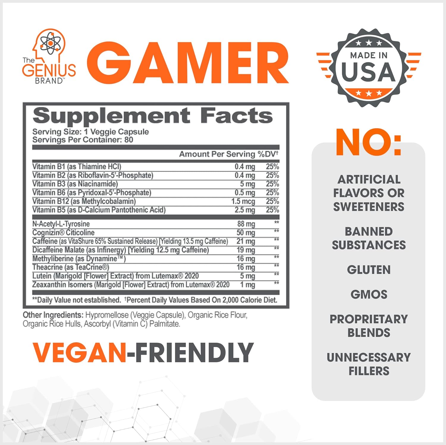 Peak Gaming Performance*: Genius Gamer By The Genius Brand Is Formulated For Serious Gamers Looking For Optimal Performance. Mental Clarity, Energy, Focus, And Increased Reaction Time Are Just A Few Of The Benefits That This Next-Level Supplement Provides.* Serving Size 1 Capsule, 80 Servings Per Container