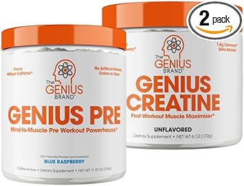 Genius Pre Workout Powder, Blue Razz, And Genius Micronized Creatine Monohydrate Powder, Unflavored, All Natural Nootropic Pre Workout And Post Workout Supplement Stack