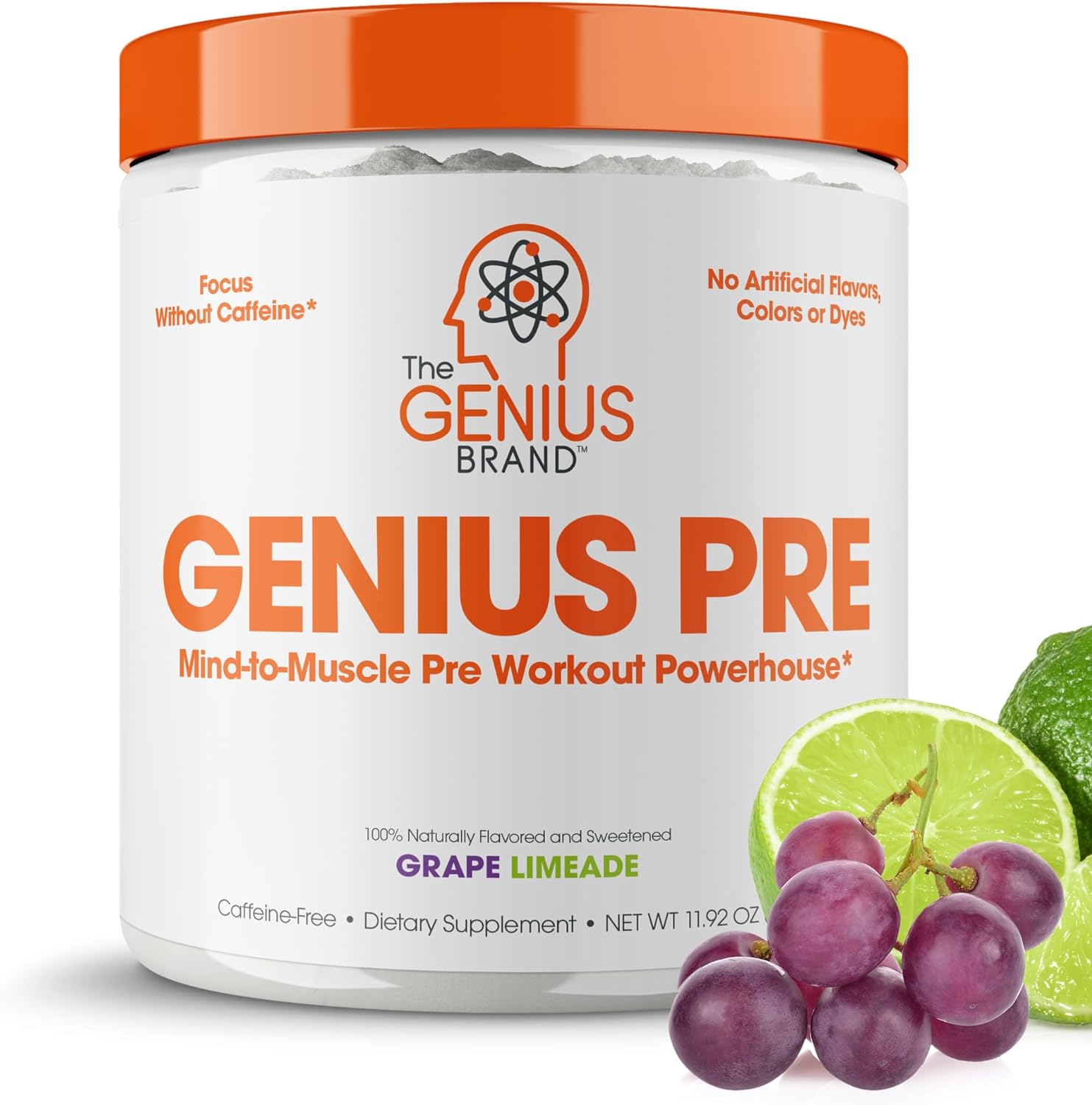3 >Mind-to-Muscle Pre-Workout: Genius Pre by The Genius Brand is a stimulant-free, nootropics-based pre- workout. Get your muscles into pump mode, support your endurance, and reduce muscle soreness after exercise with clean, scientifically-backed ingredients.* It also doubles as a productivity booster, helping you perform better both mentally and physically.* 20 scoops per container. Grape Limeade flavor