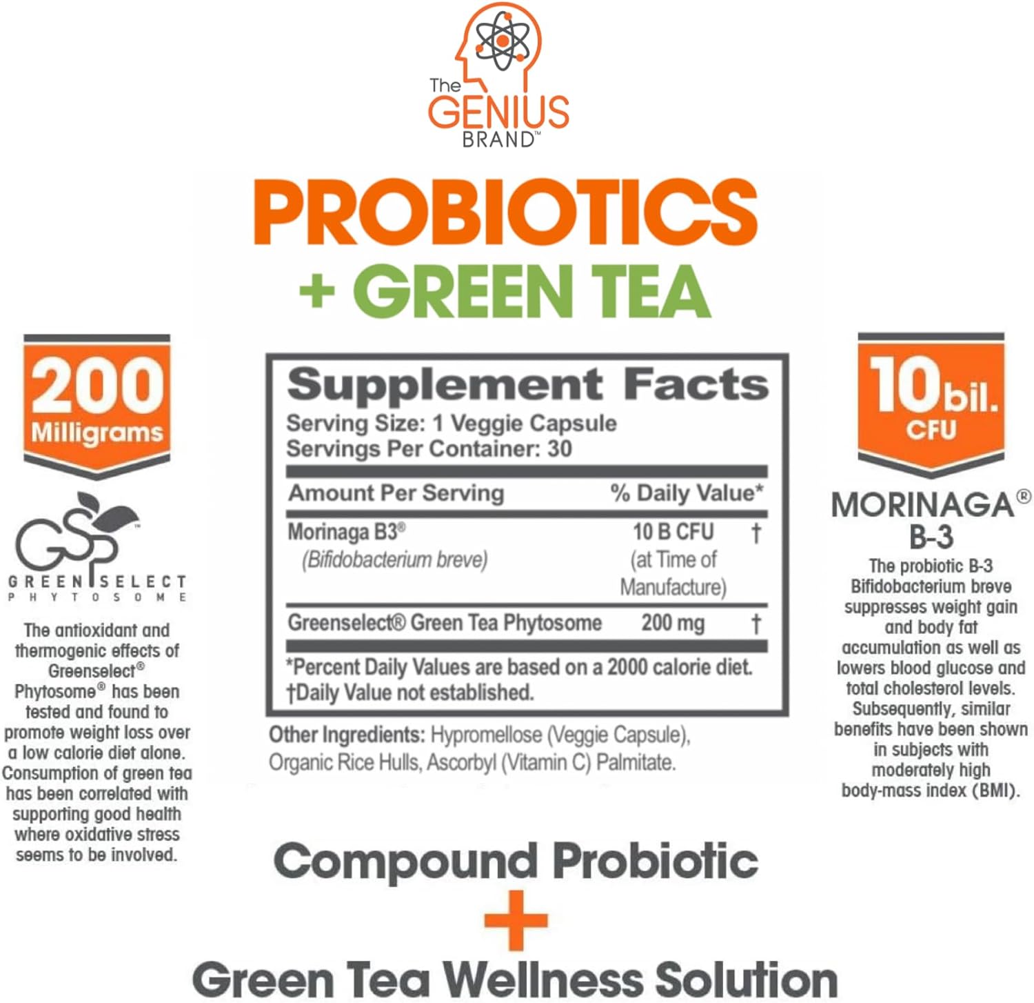 Probiotic Metabolism Booster*: Genius Pro-GT by The Genius Brand can serve as both a digestive enzyme supplement and metabolism booster with the probiotic Morinaga B-3 and caffeine-free standardized green tea extract Greenselect Phytosome.* Vegan-friendly and made in the USA without artificial flavors or sweeteners, banned substances, gluten, GMOs, proprietary blends, or unnecessary fillers. Serving Size 1 capsule, 30 servings per container10Promote Weight Management*: Morinaga has been shown to suppress weight gain and body fat accumulation. It can also support lower blood glucose and total cholesterol levels.* Green tea extract can help boost metabolism10Enhances Skin Quality and Appearance*: In addition to its belly-slimming effects, Morinaga B3 can also improve trans-epidermal skin hydration and epidermal thickening, supporting younger, more vibrant-looking skin10How to Use: Take 1 capsule daily with your morning meal10Supplement Smarter: Genius Brand supplements are a rejection of backwards industry dogma that misled generations of health and wellness enthusiasts. For us, scientific innovation and natural ingredients come first. Whether you’re a pro athlete, stay-at-home parent, retiree, or anything in between, our products can be of benefit to you. We’re all humans, and we are in this together1010