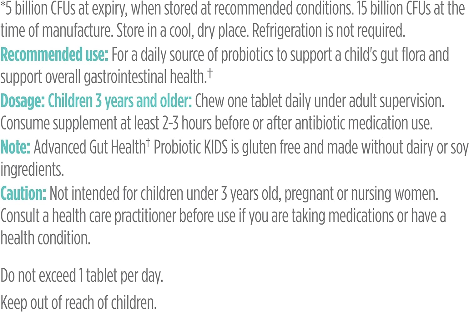 FOR LASTING BENEFITS AS THEY GROW: AGH Kids probiotic is a convenient and proactive way to help your children build stronger gut health from a young age for lasting benefits as they grow.? Our formula has been designed so it's easy to make the best choices for your kids health10STRESS LESS ABOUT SICK DAYS: By improving your child's digestion and gut health, you'll also be helping them build a stronger immune response. You can finally stress less about sick days and spend more time doing the things you love with the ones you love!10A KID-FRIENDLY, FUSS-FREE FORMULA: We guarantee your kids won't be making a fuss about these delicious lemonade, easy-to-chew tablets. Our natural formula comes in a safe dose that's designed to work gently for young, growing bodies. The unique honeycomb design is activated as soon as the probiotic comes into contact with the mouth. ?107 GENTLE & BALANCED STRAINS: Designed with 7 diverse and active strains that mimic the healthy gut bacteria already naturally thriving in your child's digestive system, this probiotic will help your child develop stronger and more resilient gut health as they age. This means they will be less prone to getting sick, experiencing digestive upset and having common symptoms of IBS, like constipation & diarrhea.?10CLEAN, PURE & DAILY SUPPORT:Created for daily use, this completely vegan probiotic is also gluten-free, non-GMO and does not contain any dairy or soy ingredients. Made for kids ages 3-12 years old10Advanced Gut Health Kids Probiotic has been designed so it's easy to make the best choices for your kids health! Our 7 strain, 5 Billion CFU formula offers gentle, proactive and safe daily tummy and immune support, to help your children build stronger and more resilient gut health from a young age for lasting benefits as they grow.? This means they will be less prone to getting sick, experiencing digestive upset and having common symptoms of IBS like constipation & diarrhea. We guarantee your kids won't be making a fuss about these delicious lemonade, easy-to-chew tablets!10