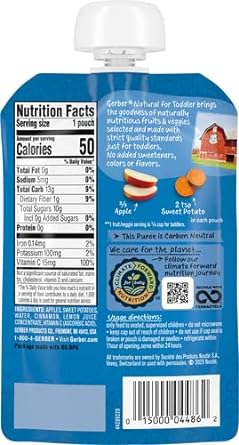 Give your toddler a variety of nutritious fruits and veggies with Gerber Squeezable Puree pouches, easy to take on the go - and now featuring our Smart Flow spout! Each pouch has two servings of natural fruit and veggies along with Vitamins C & E for healthy growth and development. In addition, our pouches are non-GMO, and are not made with artificial flavors, colors, or sweeteners. One Toddler serving is 1/4 cup fruit/vegetable3.5 oz pouch of Gerber Apple Sweet Potato with Cinnamon Toddler FoodGerber baby food is a delicious option that's easy for toddlers to eatMade with 3/4 apple and 1 tablespoon sweet potato with cinnamon for a delicious combinationNon-GMO apple puree with no artificial colors, flavors, sweeteners or added starch