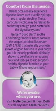 0.34 fl oz bottles of Gerber Good Start Soothe Probiotics Baby Comforting Probiotic Drops10Gerber Soothe drops contain clinically studied probiotic L. reuteri to ease colic, excessive crying and frequent spit-ups10Non GMO Gerber Soothe probiotic drops contain probiotics similar to those found in breastmilk. Product Warning: Use with adult supervision10Probiotic supplements improve good bacteria in your baby's digestive system10Gerber probiotic drops are safe from birth for healthy infants made with ingredients new moms can trust