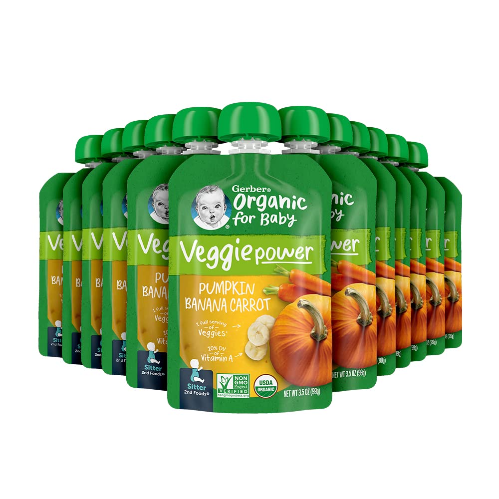 Gerber Organic Baby Food Pouches, 2nd Foods for Sitter, Veggie Power, Pumpkin Banana Carrot, 3.5 Ounce (Pack of 12)
