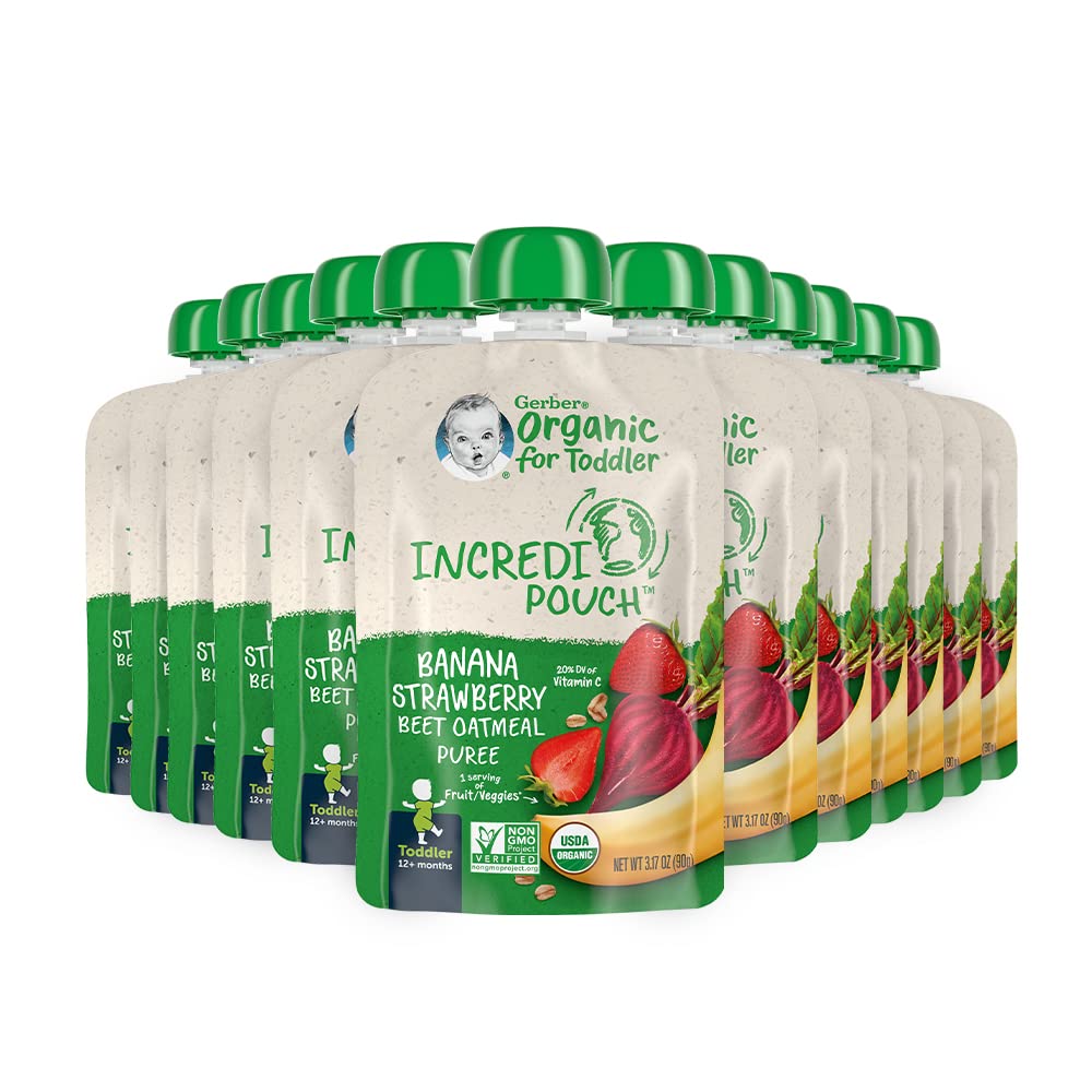 Gerber's Incredipouch packaging is a single-material pouch, moving from 4 materials to just 1 to help promote the circular economy. Our pouch is recyclable through TerraCycle. It's free and it keeps these pouches out of landfills. Gerber's Incredipouch Banana Strawberry Beet Oatmeal pouch contains 1/3 of a banana, 1.5 strawberries, 1.5 tsp of beets and 1.25 tsp of oats. Our pouches help toddlers master self-feeding. This product is certified Carbon neutral by the Carbon Trust, USDA Organic and Non GMO Project VerifiedGerber Organic Baby Food, Toddler, Incredipouch, Banana Strawberry Beet Oatmeal, 3.17 oz Puree Pouch (12 Pack)Twelve (12) 3.17 oz pouchesIncredipouch packaging is a single-material pouch, moving from 4 materials to just 1 to help promote the circular economyPouch is recyclable through TerraCycle which is free and keeps pouches out of landfills