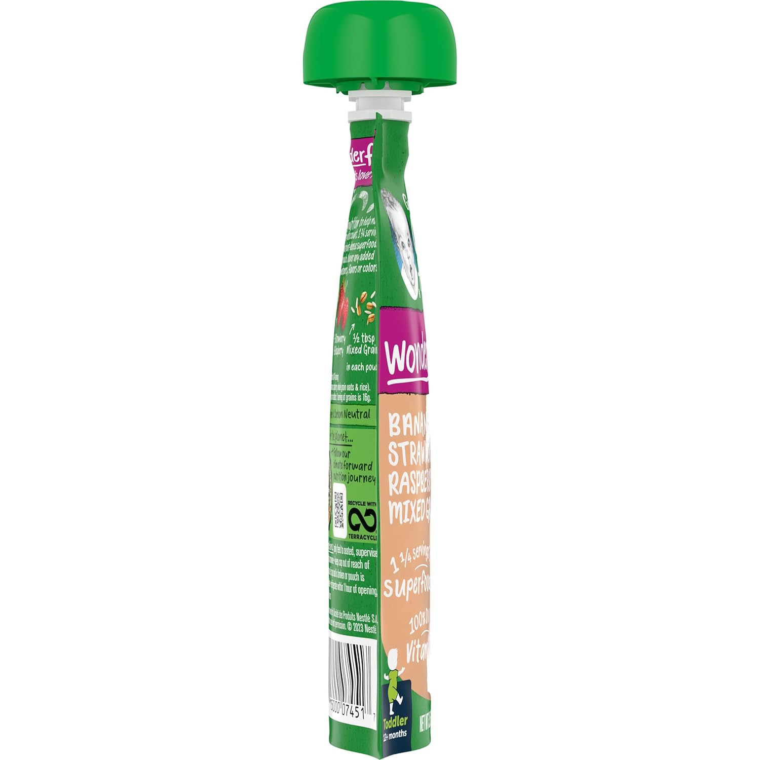 Gerber Organic Banana Strawberry Raspberry Mixed Grain Toddler Food Is A Delicious Fruit Puree That Makes It Easier For Toddlers To Feed Themselves. This Gerber Baby Food Contains 2/5 Banana, 2/3 Strawberry, 1/2 Raspberry And 1/2 Tablespoon Mixed Grains Per Pouch For Tempting Gerber Snacks. It Also Contains 5 Grams Of Whole Grains. Made With Non-Gmo Ingredients, This Usda Certified Organic Gerber Puree Contains No Artificial Flavors, Colors Or Added Starch. A Transparent Bpa-Free Baby Food Pouch Lets You See The Goodness That'S Inside, And The Toddler Pouch Fits Perfectly Into Tiny Hands To Help Your Little One Improve Feeding Skills. The Smart Flow Spout Gives Your Toddler Better Control With Fewer Messes. Feed Your Toddler From The Pouch While Seated. Refrigerate Leftover Gerber Toddler Food Within 1 Hour Of Opening And Serve Within 24 Hours