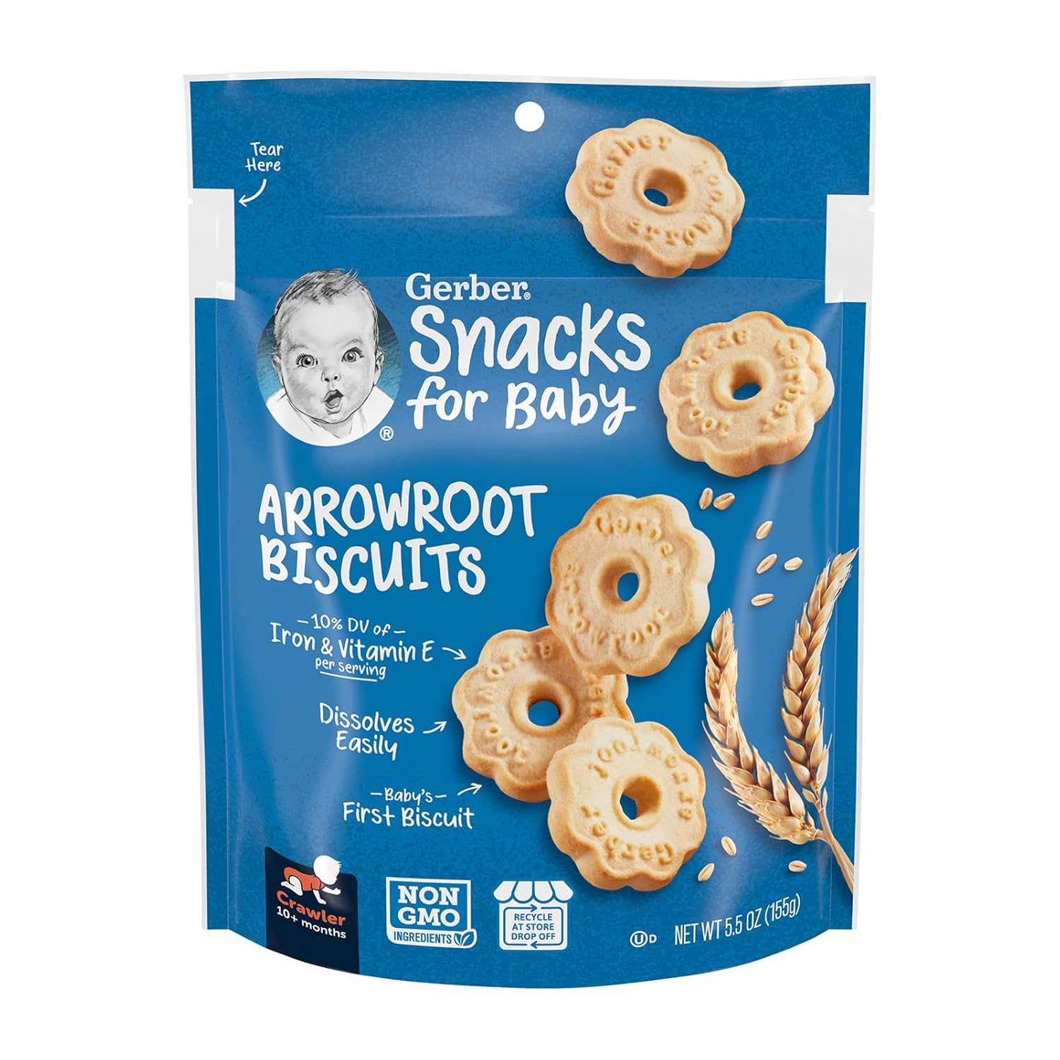 Gerber Arrowroot Cookies Are The Perfect First Baby Biscuits With A Delicious Taste Little Ones Love And The Wholesome Nutrition Parents Love. Gerber Biscuits Are Made With No Artificial Sweeteners, Flavors Or Colors And They Have 10% Daily Value Or More Of Vitamin E, Zinc, Iron And Calcium. Perfectly Sized For Learning To Hold, These Yummy Baked Snacks Are Specially Designed To Soften Quickly And Are Easily Mashed With Or Without Teeth, Making Them Easy To Chew And Swallow. These Baked Biscuits Are An Ideal Finger Food For Crawlers Who Are Accustomed To Chewing Solid Foods. Keep This Resealable Bag Of Arrowroot Cookies On Hand For Easy Baby Snacks