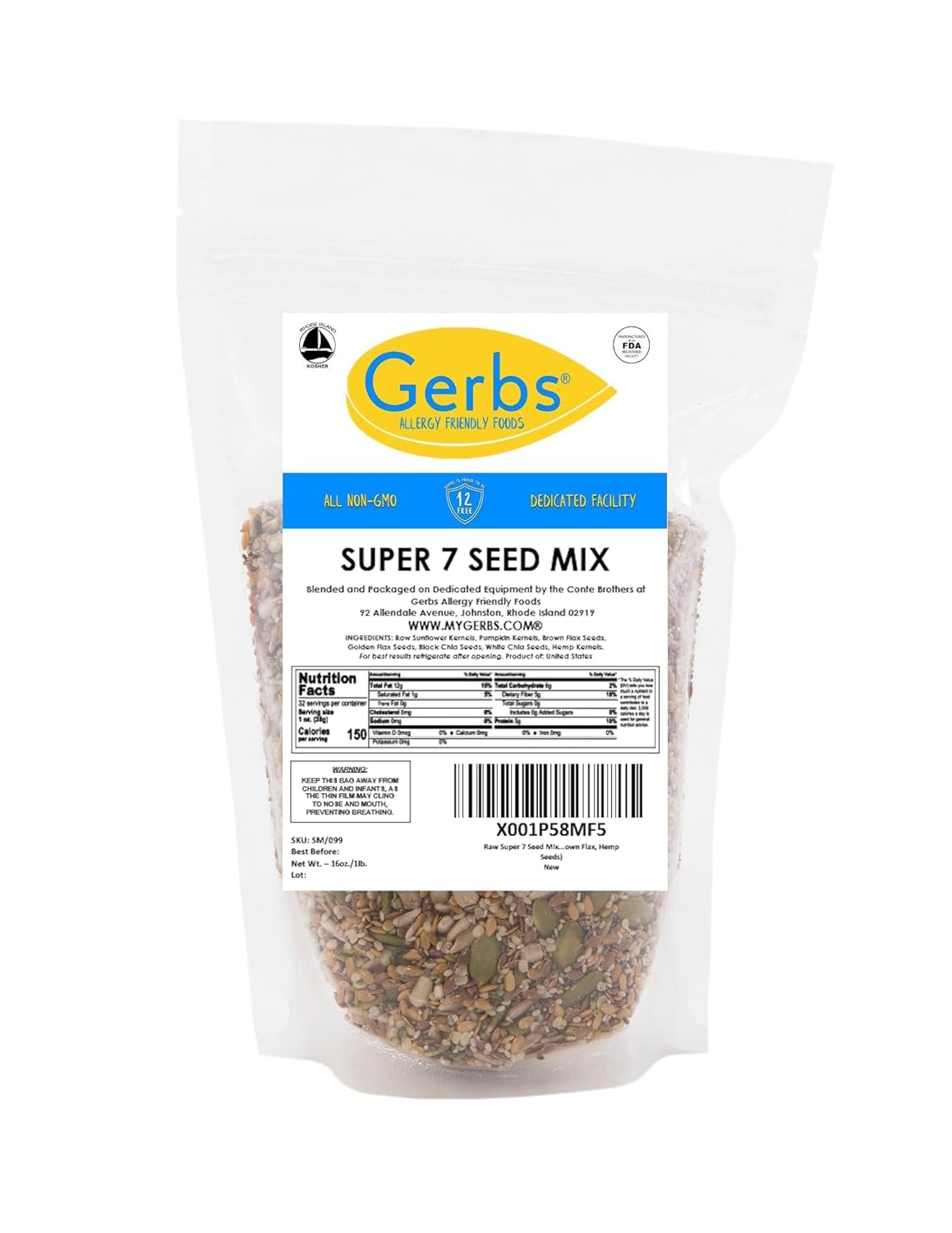 Gerbs Raw Super 7 Seed Snack Mix 1 Lb. | Top 14 Food Allergy Free | Resealable Bulk Bag | Made In Usa | Raw Pumpkin Sunflower Black & White Chia Hemp Brown & Golden Flax Seed Trail Mix | Gluten Free