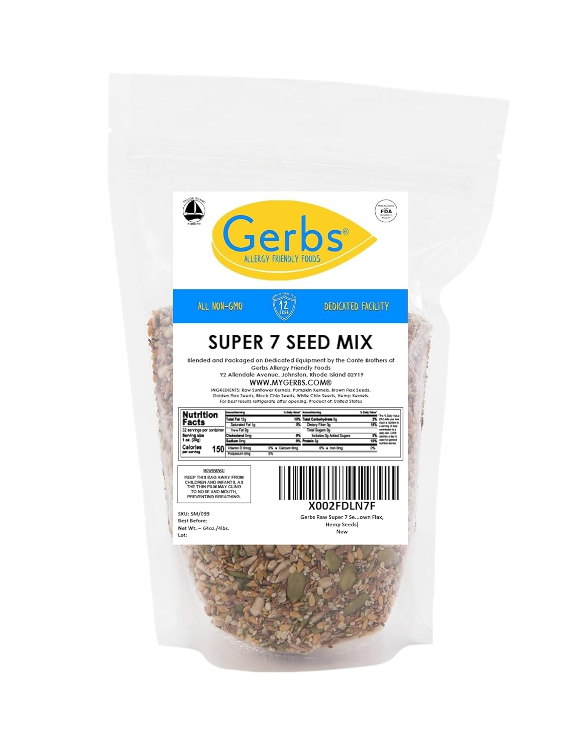 Gerbs Raw Super 7 Seed Snack Trail Mix 4 Lbs. | Top 14 Food Allergy Free | Resealable Bulk Bag | Made In Usa | Raw Pumpkin Sunflower (Black & White) Chia Hemp Brown & Golden Flax Seeds | Gluten Free
