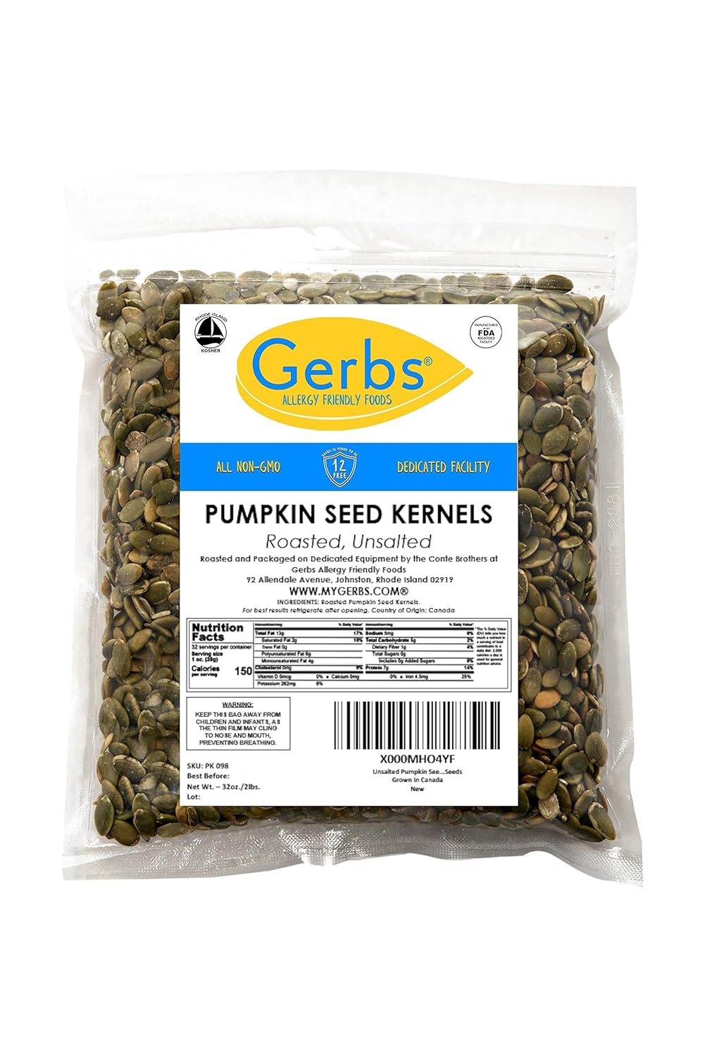 Gerbs dry roasted and unsalted pumpkin kernels are freshly harvested from our exclusive grower in Canada and roasted in-house in small batches. Each bag is meticulously packaged on dedicated allergen-free equipment in Rhode Island by our specially trained staff, ensuring quality and safety. Each 2-pound bag features a resealable design, allowing for convenient storage and preservation of freshness