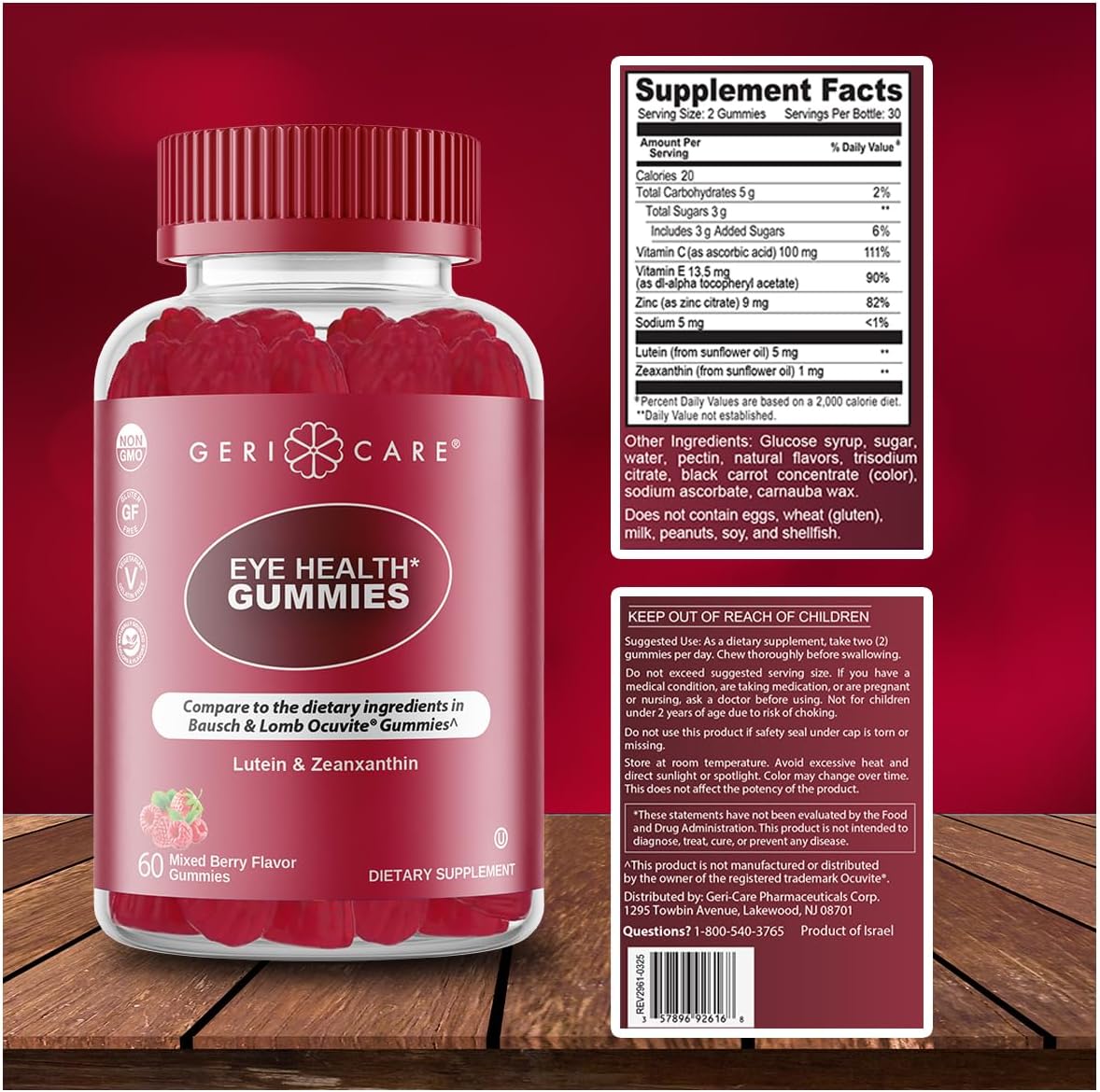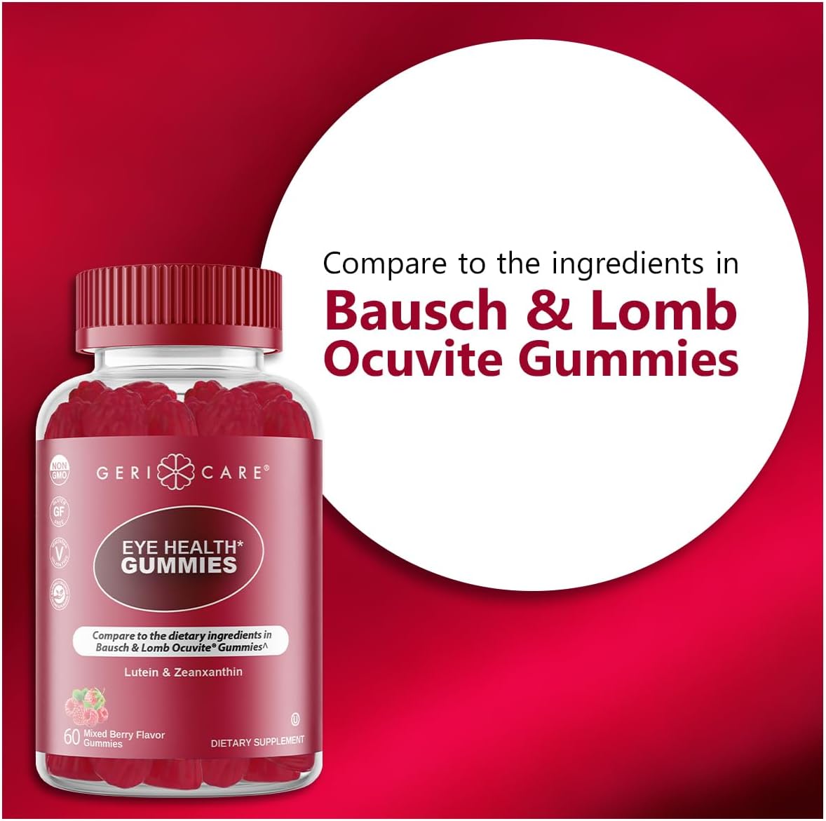 About this item EYE HEALTH SUPPORT: GeriCare Eye Health Gummies are enriched with Lutein and Zeaxanthin—two essential antioxidants that concentrate in the retina and macula of the eye. These nutrients help protect your vision from oxidative stress and daily environmental exposure. Regular supplementation may support sharper, clearer vision and overall long-term eye health. DELICIOUS MIXED BERRY FLAVOR: Each gummy delivers a tasty burst of naturally flavored mixed berries, making your daily supplement something to look forward to. There’s no bitter or medicinal aftertaste—just a sweet, fruity treat. Enjoy a delicious alternative to swallowing pills or capsules. VEGAN & PLANT-BASED FORMULA: These gummies are crafted using only plant-based ingredients, making them 100% vegan and suitable for a variety of lifestyles. There are no animal-derived ingredients, gelatin, or dairy in the formula. It's a compassionate choice that supports both your health and your values. NON-GMO & GLUTEN-FREE: GeriCare uses non-GMO ingredients to ensure purity and quality you can trust. The formula is also gluten-free, offering a safe option for individuals with gluten intolerance or sensitivities. Enjoy peace of mind with every chew, knowing what’s not in your gummies matters just as much as what is. NATURALLY SOURCED INGREDIENTS: Sourced from nature, these gummies contain no artificial preservatives, flavors, or colors. The active ingredients are derived from marigold flowers and other natural sources. This clean formula reflects GeriCare's commitment to wellness through nature. CONVENIENT & EASY TO TAKE: Designed for adults who dislike swallowing pills, these gummies provide a chewable, mess-free alternative. You can take them anytime, anywhere—no water or prep needed. Just grab, chew, and go! COGNITIVE & VISUAL FUNCTION: Beyond eye health, Lutein and Zeaxanthin have been linked to improved cognitive performance and visual processing speed. These nutrients may help support sharper thinking and better memory retention. It's a brain-and-eye health duo in every gummy. AGE-RELATED VISION SUPPORT: As we age, our eyes become more vulnerable to damage and degeneration. Lutein and Zeaxanthin help support healthy aging by protecting the macula and maintaining visual acuity. They may even reduce the risk of age-related macular degeneration (AMD) when taken consistently over time. See more product details,EYE HEALTH SUPPORT: GeriCare Eye Health Gummies are enriched with Lutein and Zeaxanthin—two essential antioxidants that concentrate in the retina and macula of the eye. These nutrients help protect your vision from oxidative stress and daily environmental exposure. Regular supplementation may support sharper, clearer vision and overall long-term eye health,DELICIOUS MIXED BERRY FLAVOR: Each gummy delivers a tasty burst of naturally flavored mixed berries, making your daily supplement something to look forward to. There’s no bitter or medicinal aftertaste—just a sweet, fruity treat. Enjoy a delicious alternative to swallowing pills or capsules,VEGAN & PLANT-BASED FORMULA: These gummies are crafted using only plant-based ingredients, making them 100% vegan and suitable for a variety of lifestyles. There are no animal-derived ingredients, gelatin, or dairy in the formula. It's a compassionate choice that supports both your health and your values,NON-GMO & GLUTEN-FREE: GeriCare uses non-GMO ingredients to ensure purity and quality you can trust. The formula is also gluten-free, offering a safe option for individuals with gluten intolerance or sensitivities. Enjoy peace of mind with every chew, knowing what’s not in your gummies matters just as much as what is,NATURALLY SOURCED INGREDIENTS: Sourced from nature, these gummies contain no artificial preservatives, flavors, or colors. The active ingredients are derived from marigold flowers and other natural sources. This clean formula reflects GeriCare's commitment to wellness through nature,CONVENIENT & EASY TO TAKE: Designed for adults who dislike swallowing pills, these gummies provide a chewable, mess-free alternative. You can take them anytime, anywhere—no water or prep needed. Just grab, chew, and go!,COGNITIVE & VISUAL FUNCTION: Beyond eye health, Lutein and Zeaxanthin have been linked to improved cognitive performance and visual processing speed. These nutrients may help support sharper thinking and better memory retention. It's a brain-and-eye health duo in every gummy,AGE-RELATED VISION SUPPORT: As we age, our eyes become more vulnerable to damage and degeneration. Lutein and Zeaxanthin help support healthy aging by protecting the macula and maintaining visual acuity. They may even reduce the risk of age-related macular degeneration (AMD) when taken consistently over time