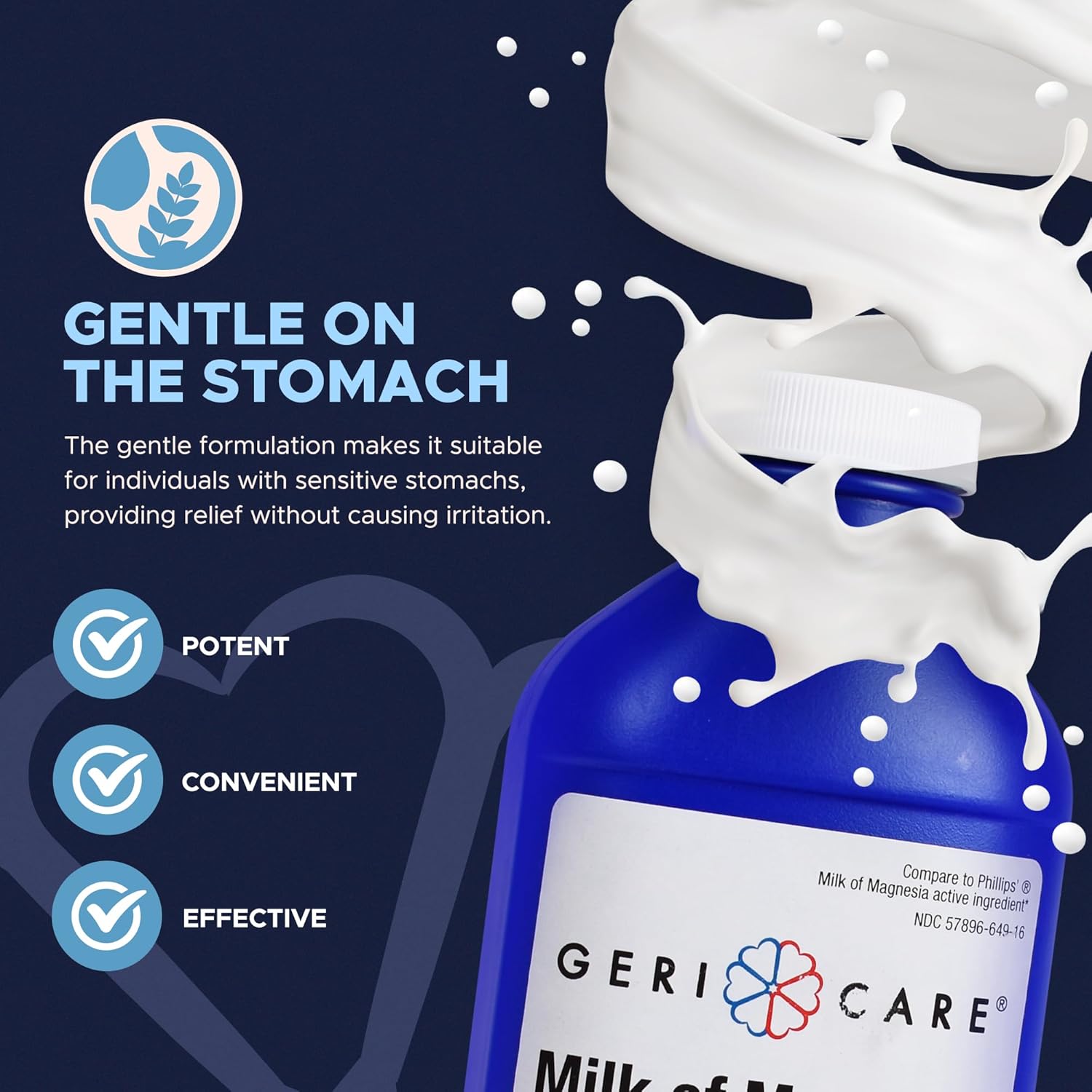 About this item FAST-ACTING RELIEF FROM PAINFUL CONSTIPATION: The GeriCare Milk of Magnesia liquid laxative works quickly to provide relief from common digestive issues, making it a go-to choice for those seeking rapid results. As a effective osmotic laxative, it works by drawing water into the intestine to induce a bowel movement in just 30 minutes to 6 hours. A SOLUTION FOR AN ARRAY OF DIGESTIVE CONCERNS: Apart from providing fast relief from occasional constipation and irregularity, our unflavored Milk of Magnesia liquid acts as an antacid to soothe your upset stomach right when you need it. Great for heartburn, indigestion or any other digestive issue that may cause you discomfort. GENTLE ON THE STOMACH. NO CRAMPS. NO SIDE EFFECTS. Delivering 1200mg of Magnesium Hydroxide in each 15ml tablespoon, the GeriCare Milk of Magnesia for constipation laxative ensures reliable results without any potential side effects. Its gentle formulation, which is completely free of added stimulants, makes it suitable for individuals with sensitive stomachs. Zero cramping, pain or discomfort. MINT FLAVOR: provides the same trusted relief from indigestion, heartburn, and constipation with a refreshing mint taste for a more pleasant experience. The cool mint flavor helps mask the chalky texture, making it easier to take while soothing your stomach. Enjoy effective digestive relief with a crisp, minty finish that leaves your mouth feeling fresh. WITH GERICAREāS SEAL OF EXCELLENCE: With 30 years of experience in creating the highest quality supplements and medical supplies that can make a true difference in your life, you have every good reason to trust GeriCare for your wellbeing. Our expert team of health professionals is always at your disposal for any questions you may have! See more product details,FAST-ACTING RELIEF FROM PAINFUL CONSTIPATION: The GeriCare Milk of Magnesia liquid laxative works quickly to provide relief from common digestive issues, making it a go-to choice for those seeking rapid results. As a effective osmotic laxative, it works by drawing water into the intestine to induce a bowel movement in just 30 minutes to 6 hours,A SOLUTION FOR AN ARRAY OF DIGESTIVE CONCERNS: Apart from providing fast relief from occasional constipation and irregularity, our unflavored Milk of Magnesia liquid acts as an antacid to soothe your upset stomach right when you need it. Great for heartburn, indigestion or any other digestive issue that may cause you discomfort,GENTLE ON THE STOMACH. NO CRAMPS. NO SIDE EFFECTS. Delivering 1200mg of Magnesium Hydroxide in each 15ml tablespoon, the GeriCare Milk of Magnesia for constipation laxative ensures reliable results without any potential side effects. Its gentle formulation, which is completely free of added stimulants, makes it suitable for individuals with sensitive stomachs. Zero cramping, pain or discomfort,MINT FLAVOR: provides the same trusted relief from indigestion, heartburn, and constipation with a refreshing mint taste for a more pleasant experience. The cool mint flavor helps mask the chalky texture, making it easier to take while soothing your stomach. Enjoy effective digestive relief with a crisp, minty finish that leaves your mouth feeling fresh,WITH GERICAREāS SEAL OF EXCELLENCE: With 30 years of experience in creating the highest quality supplements and medical supplies that can make a true difference in your life, you have every good reason to trust GeriCare for your wellbeing. Our expert team of health professionals is always at your disposal for any questions you may have!