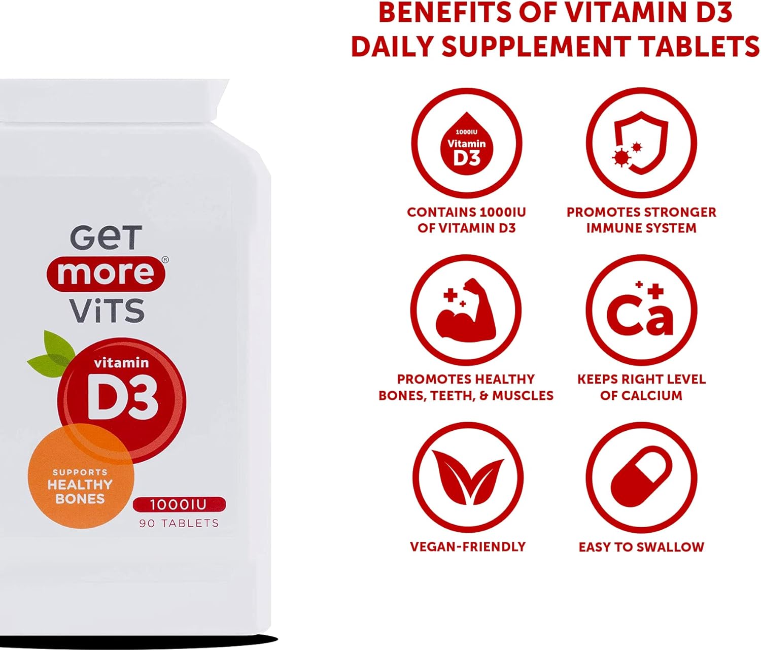 Get More Vits - Vitamin D3 Tablets (90 Tablets), 90 1,000Iu Servings Per Bottle, Strengthens Bones, Teeth & Muscles, Promotes Calcium Absorption & Improves Immune System, Vegetarian, Food Supplement