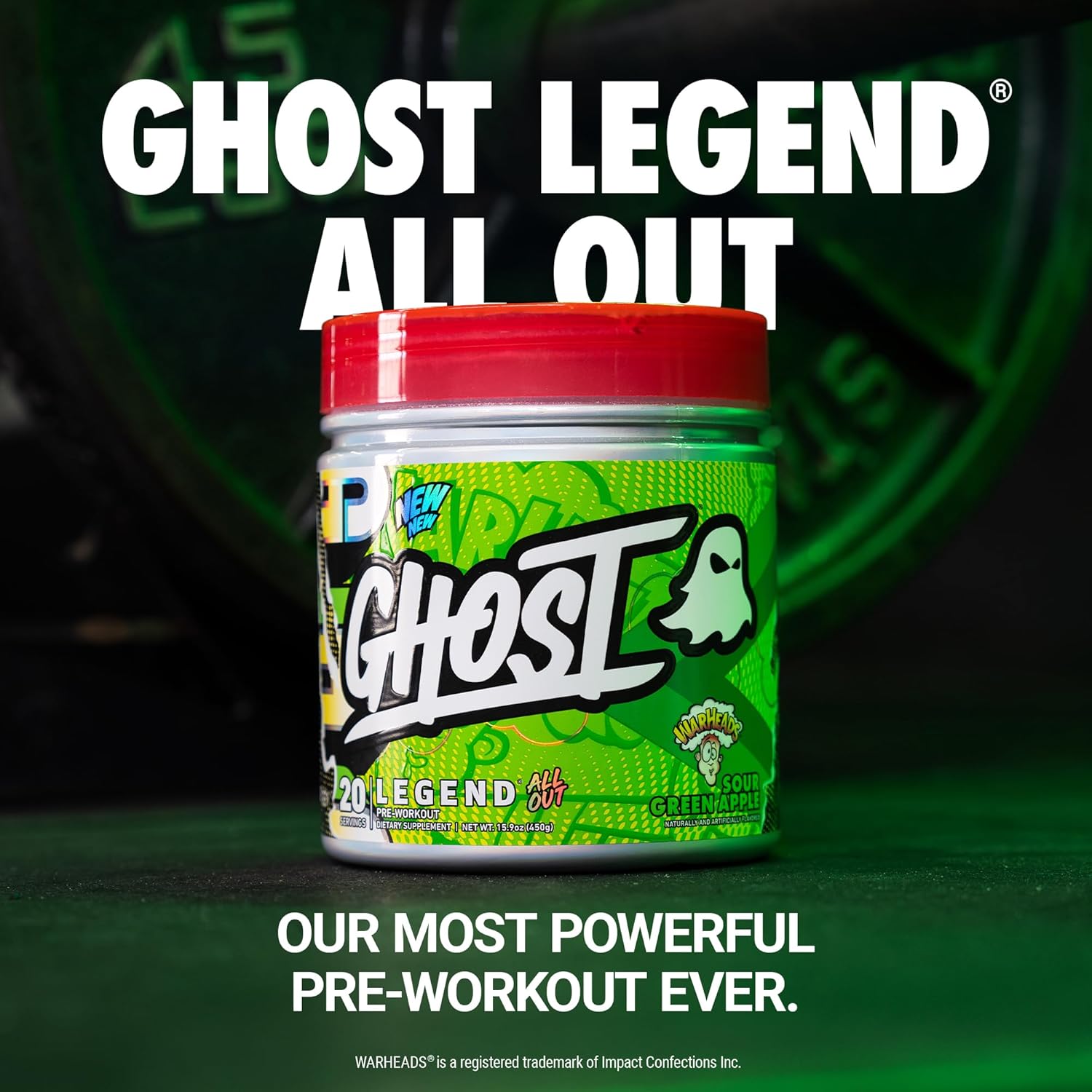 About this item Our Most Powerful Pre-Workout Ever: We worked tirelessly to create GHOST Legend All Out, a pre-workout made for hardcore gym users. This product is not for the weak. Warheads Sour Green Apple flavor. 1 scoop per serving. 20 servings per container. Send It: GHOST Legend All Out now features 6G Full Yield Citrulline, 3.2G Full Yield Beta-Alanine, and 2.5G Full Yield Betaine with triple nitrates (Citrulline, Beta-Alanine and Betaine Nitrate NO3-T)! 400MG Total Caffeine & the G.O.A.T. Vitamin C: GHOST Legend All Out is formulated with 300MG Caffeine Anhydrous and 100MG zumXR Extended Release Caffeine, designed to provide long-term energy without the crash.* Plus, enjoy a mighty 390MG dose of PureWay-C. Total Transparency: All GHOST products feature a transparent label that fully discloses the dose of each active ingredient. Zero proprietary blends mean you know what youâre getting in each and every scoop. GHOST Legend All Out is vegan friendly, gluten free, soy free, and sugar free. Be Seen: As a premium active lifestyle brand, GHOST is powering and empowering users to Be Seen beyond the walls of the gym. The name GHOST and mantra âBe Seenâ come from that feeling of being behind the scenes and wanting to be heard, waiting to make an impact. Weâre all ghosts. This is our time. See more product details,Our Most Powerful Pre-Workout Ever: We worked tirelessly to create GHOST Legend All Out, a pre-workout made for hardcore gym users. This product is not for the weak. Warheads Sour Green Apple flavor. 1 scoop per serving. 20 servings per container,Send It: GHOST Legend All Out now features 6G Full Yield Citrulline, 3.2G Full Yield Beta-Alanine, and 2.5G Full Yield Betaine with triple nitrates (Citrulline, Beta-Alanine and Betaine Nitrate NO3-T)!,400MG Total Caffeine & the G.O.A.T. Vitamin C: GHOST Legend All Out is formulated with 300MG Caffeine Anhydrous and 100MG zumXR Extended Release Caffeine, designed to provide long-term energy without the crash.* Plus, enjoy a mighty 390MG dose of PureWay-C,Total Transparency: All GHOST products feature a transparent label that fully discloses the dose of each active ingredient. Zero proprietary blends mean you know what youâre getting in each and every scoop. GHOST Legend All Out is vegan friendly, gluten free, soy free, and sugar free,Be Seen: As a premium active lifestyle brand, GHOST is powering and empowering users to Be Seen beyond the walls of the gym. The name GHOST and mantra âBe Seenâ come from that feeling of being behind the scenes and wanting to be heard, waiting to make an impact. Weâre all ghosts. This is our time