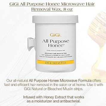 About this item Face and Body Hard Wax: Face and body microwavable hard wax for effectively removing unwanted hair. Formulated safe for tattooed skin. Works even on sensitive areas like the bikini line and underarms. Clear packaging and no muslin strips are needed. Tattoo-friendly Wax Formula: Infused with Grapeseed Oil, Argan Oil and Moringa oil to be gentle on tattoos and sensitive skin. Removes unwanted hair on tattooed skin while revitalizing color and adding depth to your tattoos. Effectively Removes Unwanted Hair: Formulated with skin-loving ingredients that help gently extract unwanted hairs straight from the roots. Leaves skin silky smooth and flawlessly hair-free. Exfoliated and hairless skin that lasts for weeks. Quick and Easy Wax Application: Packaged in a microwavable 8 oz. jar for easy storage and heating. Stays flexible, never brittle. Hardens on its own and no muslin strips are needed for removal. Trusted Waxing Brand: Created by a leader in the hair removal industry for over 40 years, GiGi is preferred by beginners and professional waxers with their top-notch waxing products and easy-to-follow instructions.  See more product details,Face and Body Hard Wax: Face and body microwavable hard wax for effectively removing unwanted hair. Formulated safe for tattooed skin. Works even on sensitive areas like the bikini line and underarms. Clear packaging and no muslin strips are needed,Tattoo-friendly Wax Formula: Infused with Grapeseed Oil, Argan Oil and Moringa oil to be gentle on tattoos and sensitive skin. Removes unwanted hair on tattooed skin while revitalizing color and adding depth to your tattoos,Effectively Removes Unwanted Hair: Formulated with skin-loving ingredients that help gently extract unwanted hairs straight from the roots. Leaves skin silky smooth and flawlessly hair-free. Exfoliated and hairless skin that lasts for weeks,Quick and Easy Wax Application: Packaged in a microwavable 8 oz. jar for easy storage and heating. Stays flexible, never brittle. Hardens on its own and no muslin strips are needed for removal,Trusted Waxing Brand: Created by a leader in the hair removal industry for over 40 years, GiGi is preferred by beginners and professional waxers with their top-notch waxing products and easy-to-follow instructions