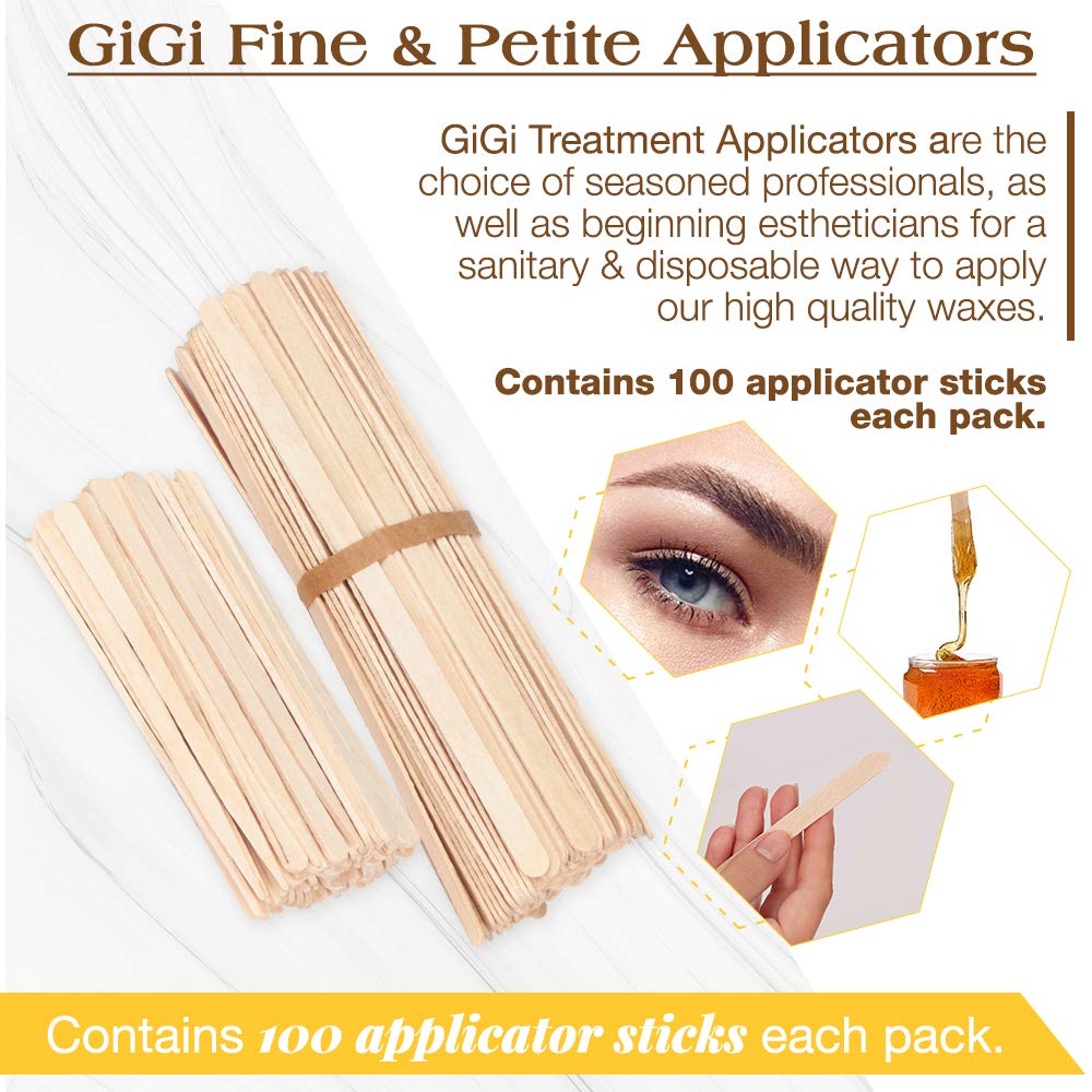 About this item FACIAL WAXING MUST-HAVE: GiGi Petite Applicators are sanitary, disposable applicators for use with our high-quality waxes. These treatment applicators are the choice of the seasoned professional, as well as the beginners for seamless waxing, especially to the delicate parts and small areas of your face. Perfect to use to remove unwanted hairs on your upper lip and to perfectly shape your eyebrows. FOR PERFECTLY-GROOMED, ON FLEEK EYEBROWS: GiGi Fine Applicators are specifically designed for eyebrow waxing. Its round edge delivers the proper placement of wax for an even, controlled application while the pointed tip allows for shaping and contouring of the eyebrows, giving you well-defined brows you’ve always wanted! ERGONOMICALLY DESIGNED. Perfect size, shape, and price! They are small and bendable making it easy to do a detail waxing on facial areas like eyebrows and upper lip. They are sturdy and will surely your go-to applicator for facial waxing! GiGi Fine and Petite Applicators are made lightweight and easy to handle compared to bigger sticks. Definitely, your wax’s perfect partner for a much smoother, silkier and hair-free skin! MADE OF HIGH-QUALITY MATERIAL. Each is made of fine quality wood, flattened and smoothened to ensure no rough edges will ever touch your skin. Thin, narrow and non-sticky, makes them perfect for upper lip, eyebrow, and overall facial hair waxing! It’s plain white finish shows the raw pure beauty, free from varnish or other harmful chemicals. Hygienically packed in 100 pieces and sealed in plastic, great for single-dip waxing procedures. SAFE AND EASY TO USE: Compared to traditional plastic or metal spatulas, GiGi Fine and Petite Applicators do not act as a heat conductor, they reduce instances of minor burns and scalds when waxing. So, as soon as the melted wax is ready to use, just put on enough amount onto the GiGi Fine and Petite Applicator, apply to the desired area of the face, let the wax cool and pull off - easy-peasy! Say hello to a new you with that smooth and lovely hairless skin in just a matter of minutes!  See more product details,FACIAL WAXING MUST-HAVE: GiGi Petite Applicators are sanitary, disposable applicators for use with our high-quality waxes. These treatment applicators are the choice of the seasoned professional, as well as the beginners for seamless waxing, especially to the delicate parts and small areas of your face. Perfect to use to remove unwanted hairs on your upper lip and to perfectly shape your eyebrows,FOR PERFECTLY-GROOMED, ON FLEEK EYEBROWS: GiGi Fine Applicators are specifically designed for eyebrow waxing. Its round edge delivers the proper placement of wax for an even, controlled application while the pointed tip allows for shaping and contouring of the eyebrows, giving you well-defined brows you’ve always wanted!,ERGONOMICALLY DESIGNED. Perfect size, shape, and price! They are small and bendable making it easy to do a detail waxing on facial areas like eyebrows and upper lip. They are sturdy and will surely your go-to applicator for facial waxing! GiGi Fine and Petite Applicators are made lightweight and easy to handle compared to bigger sticks. Definitely, your wax’s perfect partner for a much smoother, silkier and hair-free skin!,MADE OF HIGH-QUALITY MATERIAL. Each is made of fine quality wood, flattened and smoothened to ensure no rough edges will ever touch your skin. Thin, narrow and non-sticky, makes them perfect for upper lip, eyebrow, and overall facial hair waxing! It’s plain white finish shows the raw pure beauty, free from varnish or other harmful chemicals. Hygienically packed in 100 pieces and sealed in plastic, great for single-dip waxing procedures,SAFE AND EASY TO USE: Compared to traditional plastic or metal spatulas, GiGi Fine and Petite Applicators do not act as a heat conductor, they reduce instances of minor burns and scalds when waxing. So, as soon as the melted wax is ready to use, just put on enough amount onto the GiGi Fine and Petite Applicator, apply to the desired area of the face, let the wax cool and pull off - easy-peasy! Say hello to a new you with that smooth and lovely hairless skin in just a matter of minutes!
