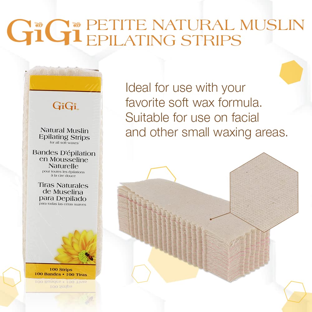 About this item Pre-cut Small Muslin Epilating Strips: Perfect for removing unsightly hairs on eyebrows, lips and other small areas of the body. Preferred by spas and salon estheticians for their high quality and great adhesion. High-Quality Muslin Fabric: Durable material, resists tearing and shredding. It helps remove hair front the root in just one pull. Minimizes hair breakage. Smooth Waxing Experience: High thread count and fine weave texture for maximum absorption with minimum pulling effort. Ensures wax will not seep through for an efficient and mess-free hair removal experience. Great Value for Money:100 pieces high-quality facial waxing strips so you never run out of supplies. Perfectly sized at 1 3/4" x 4 1/2" for your waxing convenience without hurting your pocket. Pro-approved, Trusted Brand: GiGi is a leader for hair removal and waxing products. GiGi products are 100% cruelty-free, never tested on animals. See more product details,Pre-cut Small Muslin Epilating Strips: Perfect for removing unsightly hairs on eyebrows, lips and other small areas of the body. Preferred by spas and salon estheticians for their high quality and great adhesion,High-Quality Muslin Fabric: Durable material, resists tearing and shredding. It helps remove hair front the root in just one pull. Minimizes hair breakage,Smooth Waxing Experience: High thread count and fine weave texture for maximum absorption with minimum pulling effort. Ensures wax will not seep through for an efficient and mess-free hair removal experience,Great Value for Money:100 pieces high-quality facial waxing strips so you never run out of supplies. Perfectly sized at 1 3/4" x 4 1/2" for your waxing convenience without hurting your pocket,Pro-approved, Trusted Brand: GiGi is a leader for hair removal and waxing products. GiGi products are 100% cruelty-free, never tested on animals