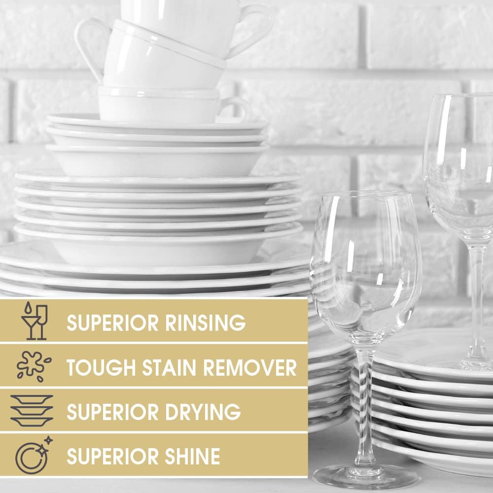 Plant-Based: Made from plants, not petroleum. The biodegradable formulation is the perfect green solution for your dishwasher10Superior Rinsing: Fights spots and streaks and helps to remove the toughest stains like coffee and tea on the first wash. Removes hard water stains and buildup and attacks baked on food. No need to pre-rinse10Superior Drying & Shine: Incredible results vs. using detergent alone. Dishes, glasses, plasticware and flatware never looked so good10Excellent For Commercial Washers: Perfect for restaurants with large capacity washers, effective in both high and low temperature dishwashing machines10Effective With Hard Water: Can be used in low to medium hard water conditions