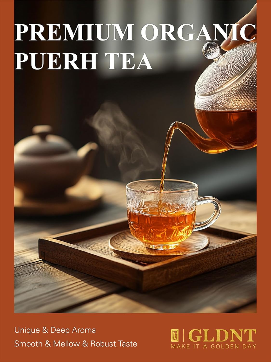 Gldnt Organic Pu-Erh Tea, Yunnan Ripe Pu'Erh Tea Loose Leaf, Fermented Dark Tea, Bold & Smooth Flavor, Caffeinated, 16Oz