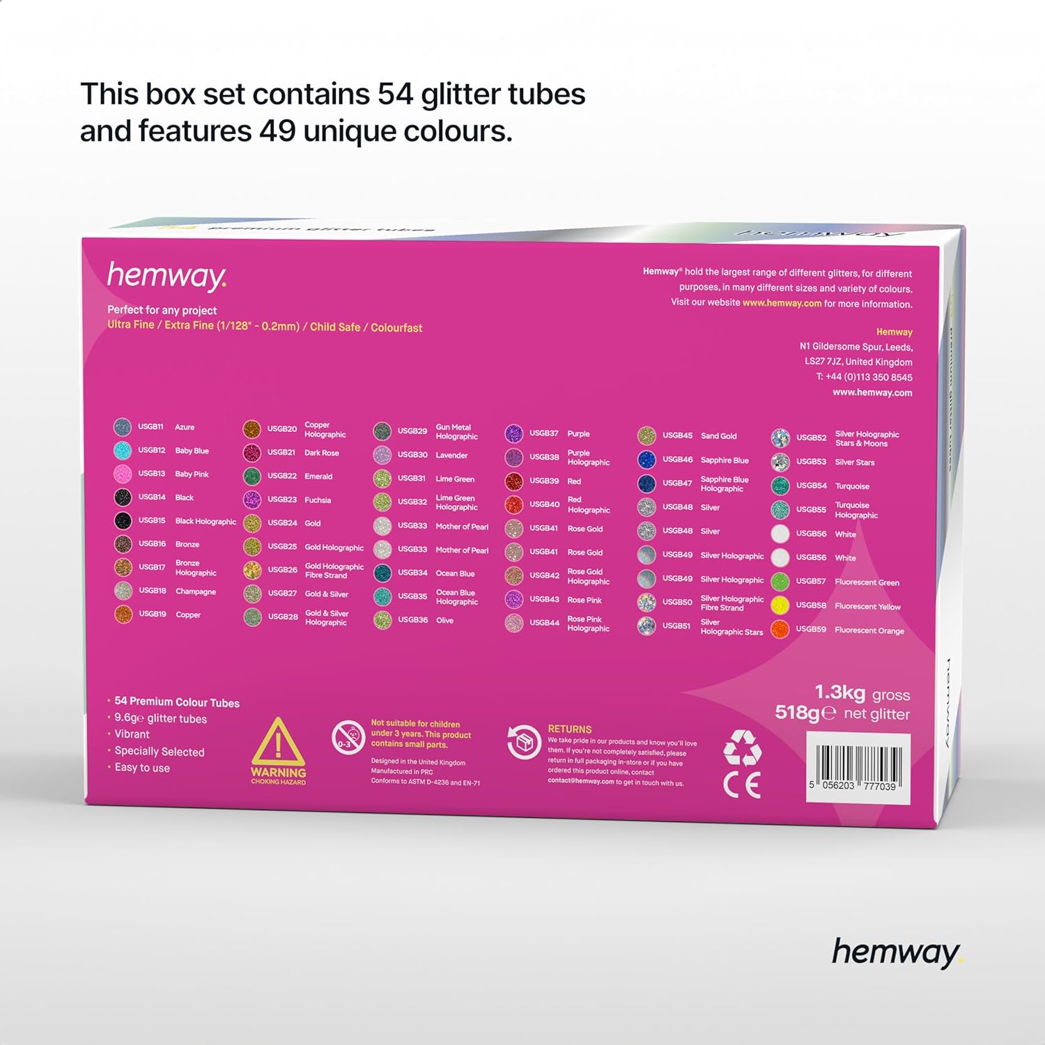 ULTRA FINE MIXED GLITTER: Our glitter set contains 54 x 6 g (0.21oz) shaker pots of extra fine (0.2 mm) sparkly mixed glitter in different shapes & colours; includes holographic, metallic, iridescent, neon, stars & moon flakes. Hemway is a British brand and we manufacture our products to the highest standards of quality