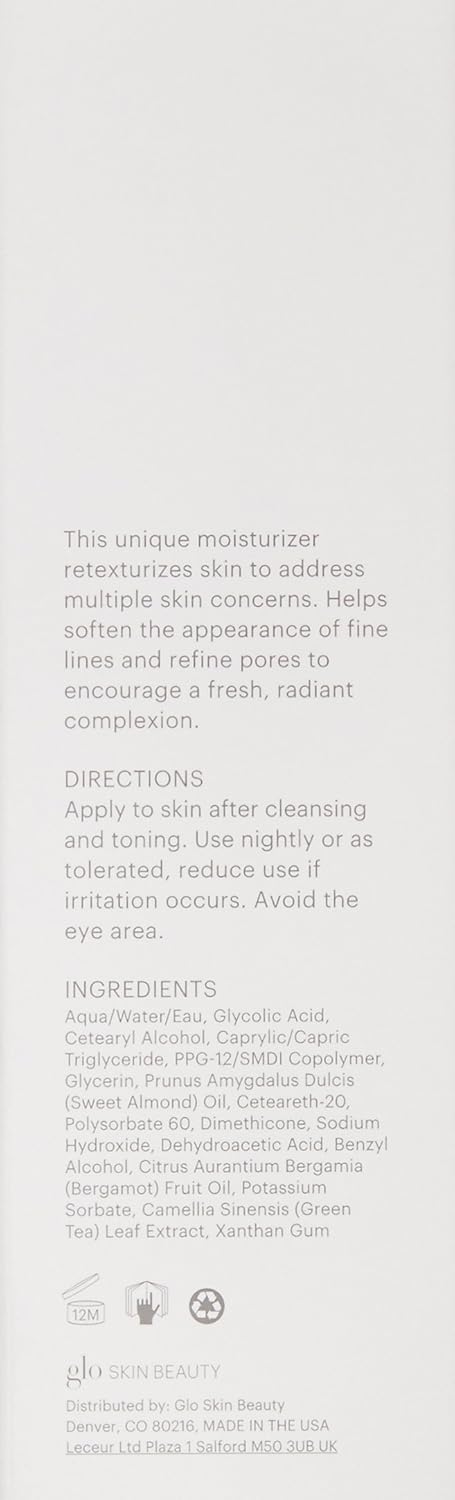About this item RESURFACING CREAM: Smooths, softens and refines the complexion. Formerly Known as: 10% Glycolic Cream MOISTURIZING: A unique moisturizer that retexturizes skin to address multiple skin concerns RADIANCE: This moisturizer helps soften the appearance of fine lines and refine pores to encourage a fresh, radiant complexion RENEW: Ideal for addressing uneven skin texture and softening fine lines. Helps even skin texture for smoother, softer skin. Great for all skin types except sensitive GLO SKIN BEAUTY: The promise of healthy, beautiful skin from Glo Skin Beauty. Our innovative skincare and nourishing mineral makeup collections work together seamlessly to reveal your authentic best See more product details,RESURFACING CREAM: Smooths, softens and refines the complexion. Formerly Known as: 10% Glycolic Cream,MOISTURIZING: A unique moisturizer that retexturizes skin to address multiple skin concerns,RADIANCE: This moisturizer helps soften the appearance of fine lines and refine pores to encourage a fresh, radiant complexion,RENEW: Ideal for addressing uneven skin texture and softening fine lines. Helps even skin texture for smoother, softer skin. Great for all skin types except sensitive,GLO SKIN BEAUTY: The promise of healthy, beautiful skin from Glo Skin Beauty. Our innovative skincare and nourishing mineral makeup collections work together seamlessly to reveal your authentic best