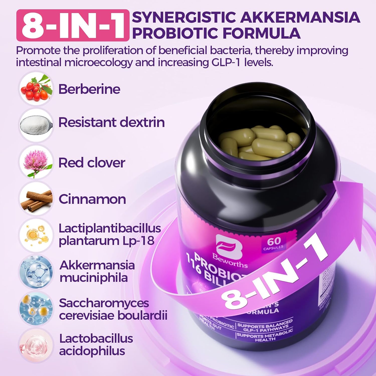 About this item ?POWERFUL PROBIOTIC? Our B BEWORTHS Probiotics contains 100 billion CFU of Akkermansia probiotics per serving. Powerful Akkermansia probiotics for men and women. Providing you with the best GLP-1 supplement to help improve your digestive system and intestinal health, gas, bloating and immune support, strengthen* and protect the intestinal lining, and promote GLP-1 production. ?ADVANCED GUT SUPPORT FORMULA ? Our AKK Probiotic formula is the new and improved version of AKK+ Probiotic.100 Billion CFU Akkermansia uniquely blended with Berberine. This powerful gut health formula strengthens the gut-brain axis and is designed to enhance ongoing two-way communication between the gut and brain, targets to Gl barrierfunction, intestinal walls, digestive, gut and immune health, and GLP-1 production. ?8-IN-1 SYNERGISTIC FORMULA? Akkermansia strains account for about 4% of the intestinal bacteria in healthy people and are essential for a healthy intestinal flora. Our 8-in-1 herbal synergistic formula can increase the level of Akkermansia, inhibit the growth of some harmful bacteria, and promote the proliferation of beneficial bacteria, thereby improving the intestinal microecology. Promote GLP-1 levels, produce GLP-1 and maintain GLP-1 active . ?POWERFUL ANTIOXIDANT DEFENSE? Enteric-coated, extended-release probiotic capsules encapsulate our B BEWORTHS proprietary probiotic blend with berberine and red clover extract, ensuring the strains are able to pass through stomach acid and reach the intestinal flora to work. Protects the intestinal lining from irritation, break down fiber, and promotes the growth of other beneficial microorganisms. ?SAFE AND EFFECTIVE? Each production is tested for purity and safety by an ISO-accredited third-party lab. This powerful blend Formula helps build a diverse, healthy gut microbiome ecosystem, metabolize, enhance overall immunity, maintain gut health, and get more GLP-1. Take 2 capsules daily , for gut flora & digestive issues. › See more product details,?POWERFUL PROBIOTIC? Our B BEWORTHS Probiotics contains 100 billion CFU of Akkermansia probiotics per serving. Powerful Akkermansia probiotics for men and women. Providing you with the best GLP-1 supplement to help improve your digestive system and intestinal health, gas, bloating and immune support, strengthen* and protect the intestinal lining, and promote GLP-1 production,?ADVANCED GUT SUPPORT FORMULA ? Our AKK Probiotic formula is the new and improved version of AKK+ Probiotic.100 Billion CFU Akkermansia uniquely blended with Berberine. This powerful gut health formula strengthens the gut-brain axis and is designed to enhance ongoing two-way communication between the gut and brain, targets to Gl barrierfunction, intestinal walls, digestive, gut and immune health, and GLP-1 production,?8-IN-1 SYNERGISTIC FORMULA? Akkermansia strains account for about 4% of the intestinal bacteria in healthy people and are essential for a healthy intestinal flora. Our 8-in-1 herbal synergistic formula can increase the level of Akkermansia, inhibit the growth of some harmful bacteria, and promote the proliferation of beneficial bacteria, thereby improving the intestinal microecology. Promote GLP-1 levels, produce GLP-1 and maintain GLP-1 active,?POWERFUL ANTIOXIDANT DEFENSE? Enteric-coated, extended-release probiotic capsules encapsulate our B BEWORTHS proprietary probiotic blend with berberine and red clover extract, ensuring the strains are able to pass through stomach acid and reach the intestinal flora to work. Protects the intestinal lining from irritation, break down fiber, and promotes the growth of other beneficial microorganisms,?SAFE AND EFFECTIVE? Each production is tested for purity and safety by an ISO-accredited third-party lab. This powerful blend Formula helps build a diverse, healthy gut microbiome ecosystem, metabolize, enhance overall immunity, maintain gut health, and get more GLP-1. Take 2 capsules daily , for gut flora & digestive issues