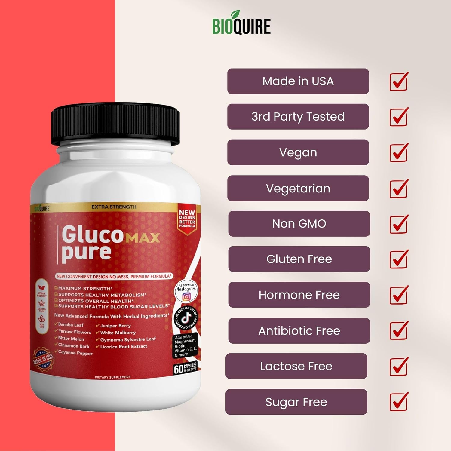 Gluco Max Pure is a premium dietary supplement designed to help support healthy blood sugar levels and overall well-being*. Our advanced herbal formula combines trusted ingredients like Banaba Leaf, Gymnema Sylvestre, Bitter Melon, and Licorice Root Extract, known for their traditional use in promoting balance and health*. In addition, this supplement contains key vitamins and minerals such as Magnesium, Zinc, Vitamin C, Biotin, and more to optimize metabolism and provide daily nutritional support*. With 60 easy-to-swallow capsules, Gluco Max Pure is a simple addition to your daily routine. Vegan-friendly, gluten-free, and non-GMO, it’s crafted with care for health-conscious individuals. Manufactured in the USA in a GMP-certified facility for quality assurance, this supplement is a great choice for those seeking natural support in their wellness journey. Legal Disclaimer: This product is not intended to diagnose, treat, cure, or prevent any disease,Advanced Herbal Formula: Combines Banaba Leaf, Gymnema Sylvestre, Bitter Melon, and Licorice Root to support your overall wellness,Essential Vitamins & Minerals: Includes Magnesium, Zinc, Vitamin C, Biotin, and more to optimize your health,Convenient & Easy-to-Use: Premium formula in a no-mess, easy-to-swallow capsule design; take 1-2 capsules daily,Vegan & Gluten-Free: Made with high-quality, plant-based ingredients; non-GMO, vegan-friendly, and gluten-free for peace of mind,Made in the USA: Manufactured in a GMP-certified facility with strict quality control standards to ensure a safe, effective supplement