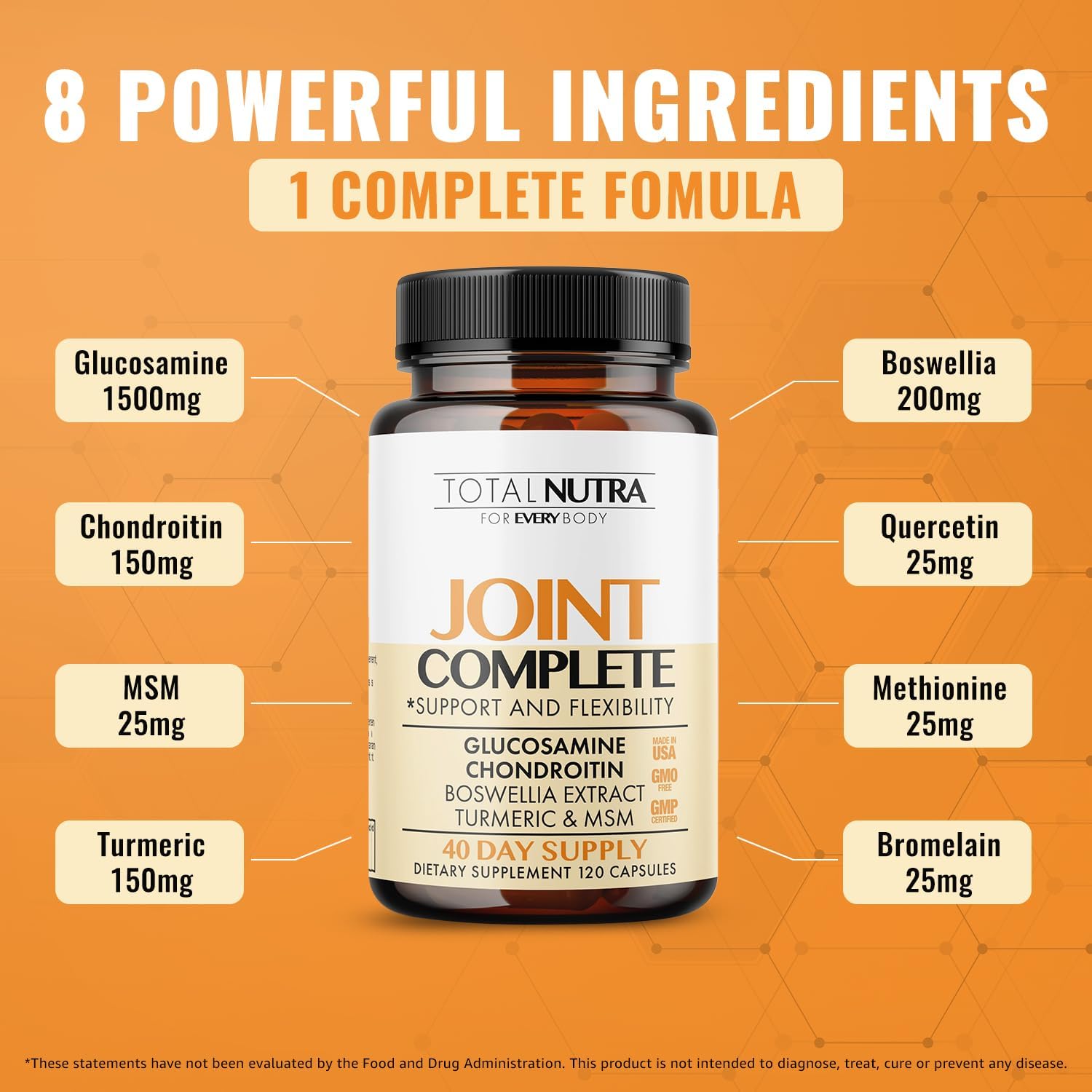 About this item EIGHT-IN-ONE JOINT SUPPLEMENTS: Total Nutra’s Chondroitin & Glucosamine Nutritional Supplements combine 8 powerful Cartilage, Ligament, Tendon & Joint Care Ingredients into one mighty Glucosamine Complex to support joint mobility, flexibility & overall comfort. We’re sure you’ll love these fast-acting joint relief supplements CARTILAGE & LIGAMENTS: Made with Glucosamine 1500mg, Chondroitin Sulfate, Boswellia, Turmeric, Quercetin, Methionine, MSM & Bromelain, this robust Glucosamine Supplement has immune balancing properties, can help soothe swelling & irritation, and works to supports collagen production to prevent loss of cartilage REDUCE DISCOMFORT: Our MSM contains bioavailable sulfur, which is an important structural ingredient in healthy joints and tissues, including hair, skin & nails. These ligament and tendon supplements are ideal for occasional discomfort from age, weight or athletic performance. Trust our joint & knee supplement for the extra care & nutrition joints need SUPPORT AN ACTIVE LIFESTYLE with the power of nature! Harness the antioxidant properties of this ultra effective MSM supplement infused with glucosamine, chondroitin, and turmeric to lubricate joints so you can say goodbye to discomfort & hello to a free, active lifestyle! MADE IN THE USA - Our mission is to make the world healthier one supplement at a time with the highest quality, safely formulated nutritional supplements available. This glucosamine and chondroitin joint supplement is third-party tested for purity & safety. If you don’t absolutely love our joint supplements for women & men our team is standing by to help See more product details,EIGHT-IN-ONE JOINT SUPPLEMENTS: Total Nutra’s Chondroitin & Glucosamine Nutritional Supplements combine 8 powerful Cartilage, Ligament, Tendon & Joint Care Ingredients into one mighty Glucosamine Complex to support joint mobility, flexibility & overall comfort. We’re sure you’ll love these fast-acting joint relief supplements,CARTILAGE & LIGAMENTS: Made with Glucosamine 1500mg, Chondroitin Sulfate, Boswellia, Turmeric, Quercetin, Methionine, MSM & Bromelain, this robust Glucosamine Supplement has immune balancing properties, can help soothe swelling & irritation, and works to supports collagen production to prevent loss of cartilage,REDUCE DISCOMFORT: Our MSM contains bioavailable sulfur, which is an important structural ingredient in healthy joints and tissues, including hair, skin & nails. These ligament and tendon supplements are ideal for occasional discomfort from age, weight or athletic performance. Trust our joint & knee supplement for the extra care & nutrition joints need,SUPPORT AN ACTIVE LIFESTYLE with the power of nature! Harness the antioxidant properties of this ultra effective MSM supplement infused with glucosamine, chondroitin, and turmeric to lubricate joints so you can say goodbye to discomfort & hello to a free, active lifestyle!,MADE IN THE USA - Our mission is to make the world healthier one supplement at a time with the highest quality, safely formulated nutritional supplements available. This glucosamine and chondroitin joint supplement is third-party tested for purity & safety. If you don’t absolutely love our joint supplements for women & men our team is standing by to help