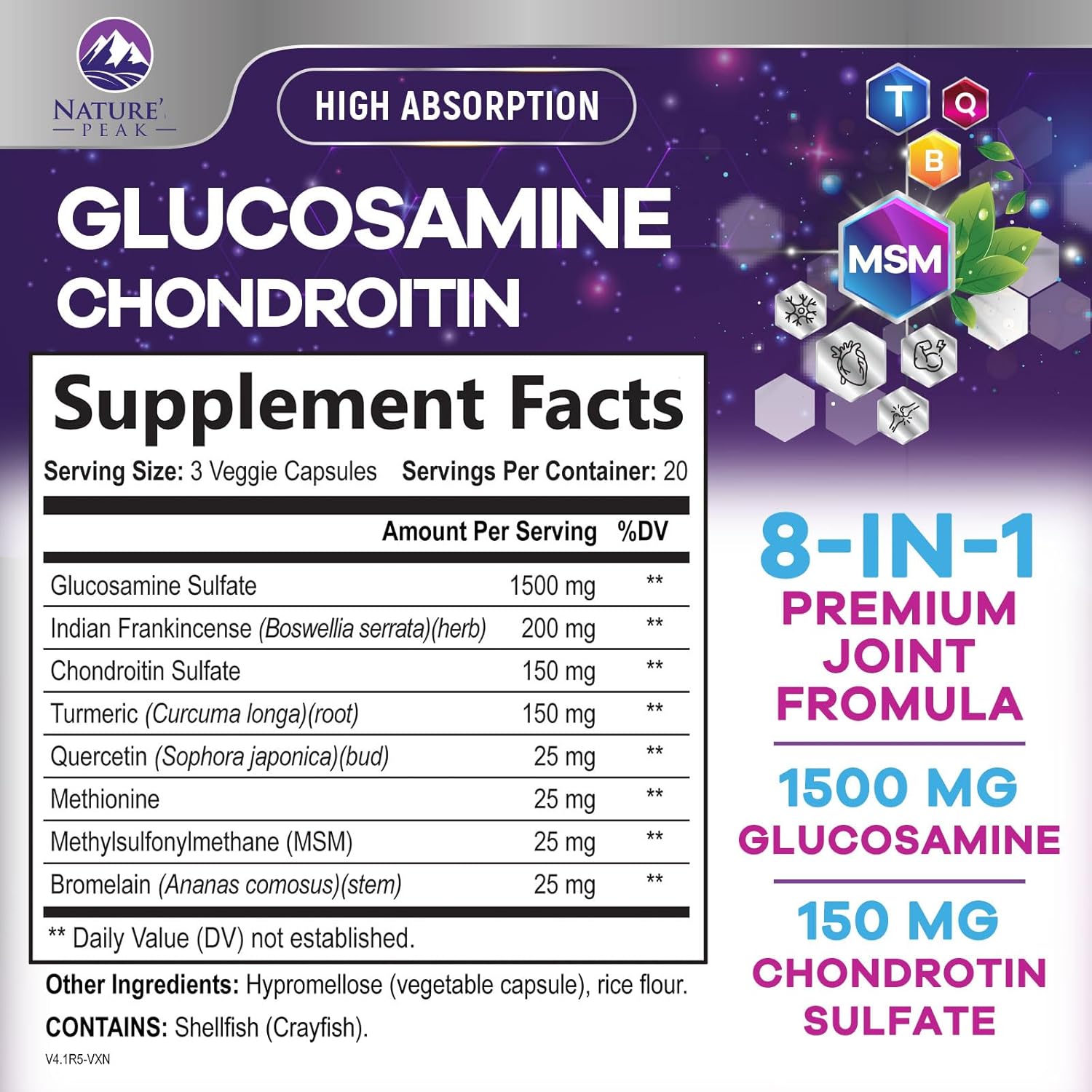 About this item EXTRA-STRENGTH FORMULA: Our Glucosamine Chondroitin MSM Complex, a joint support supplement, features a strong blend of glucosamine, chondroitin, and MSM for joint health support and mobility CHONDROITIN SULFATE: Works in tandem with Glucosamine by absorbing water into cartilage and connective tissue to support the shock-absorbing ability of your joints MSM: Combined with other joint health ingredients like Turmeric, Boswellia extract, and MSM our supplement helps offer premium joint support TRUSTED SUPPLEMENT: All Nature's Peak supplements are manufactured following strict cGMP guidelines and 3rd party tested for quality and purity CHONDROITIN & GLUCOSAMINE NUTRITIONAL SUPPLEMENTS: Triple strength joint support supplement capsules with glucosamine boswellia chondroitin sulfate turmeric msm bromelain from natures nutrition for humans people adults women men best back knee hand mobility health support complex 1200mg 1500mg 1500 mg flex extra osteo move movement cartilage bone advanced formula vitamins โบ See more product details,EXTRA-STRENGTH FORMULA: Our Glucosamine Chondroitin MSM Complex, a joint support supplement, features a strong blend of glucosamine, chondroitin, and MSM for joint health support and mobility,CHONDROITIN SULFATE: Works in tandem with Glucosamine by absorbing water into cartilage and connective tissue to support the shock-absorbing ability of your joints,MSM: Combined with other joint health ingredients like Turmeric, Boswellia extract, and MSM our supplement helps offer premium joint support,TRUSTED SUPPLEMENT: All Nature's Peak supplements are manufactured following strict cGMP guidelines and 3rd party tested for quality and purity,CHONDROITIN & GLUCOSAMINE NUTRITIONAL SUPPLEMENTS: Triple strength joint support supplement capsules with glucosamine boswellia chondroitin sulfate turmeric msm bromelain from natures nutrition for humans people adults women men best back knee hand mobility health support complex 1200mg 1500mg 1500 mg flex extra osteo move movement cartilage bone advanced formula vitamins