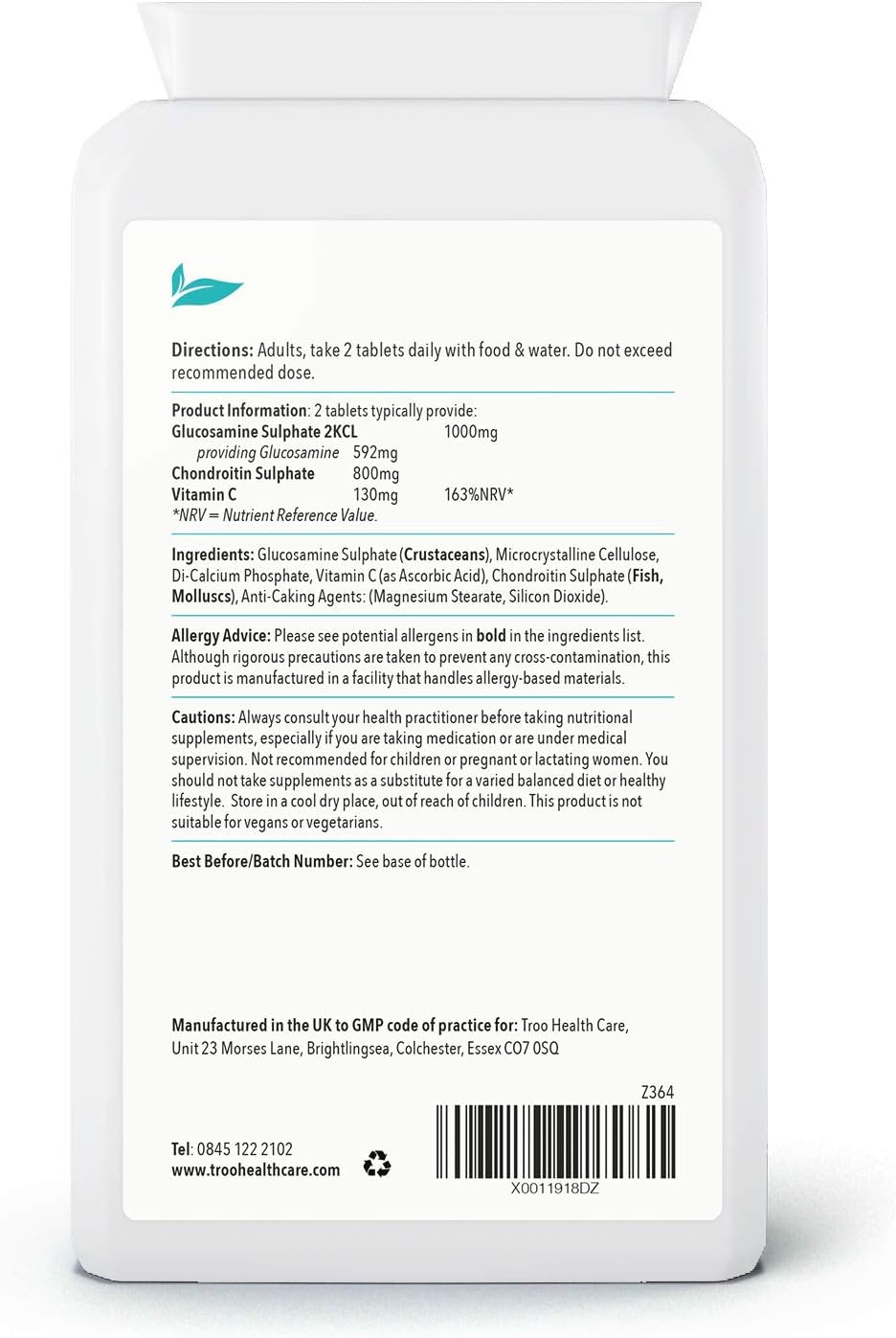 BULLET POINTS : 1 > SYNERGISTIC GLUCOSAMINE JOINT SUPPORT SUPPLEMENT - Troo Health's Glucosamine & Chondroitin Tablets provide a synergistic and potent blend of Glucosamine, Chondroitin and Vitamins C to help maintain healthy joint function. FREE FROM lactose, gluten, dairy, wheat, artificial colours & preservatives and GMOs