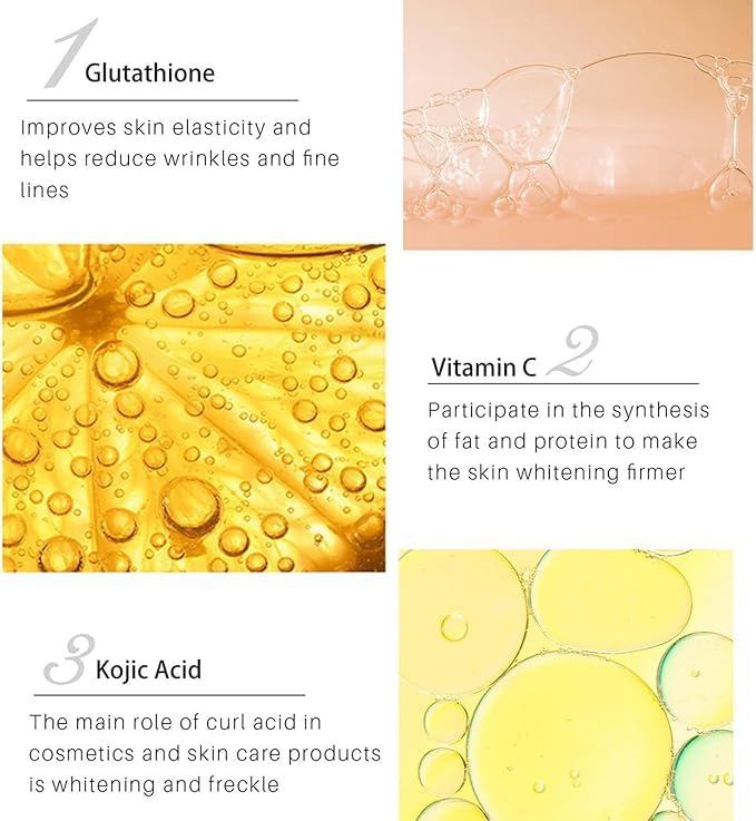 - Brightens & Evens Skin Tone: Enriched with Glutathione and Kojic Acid to visibly reduce dark spots, blemishes, and uneven pigmentation.
