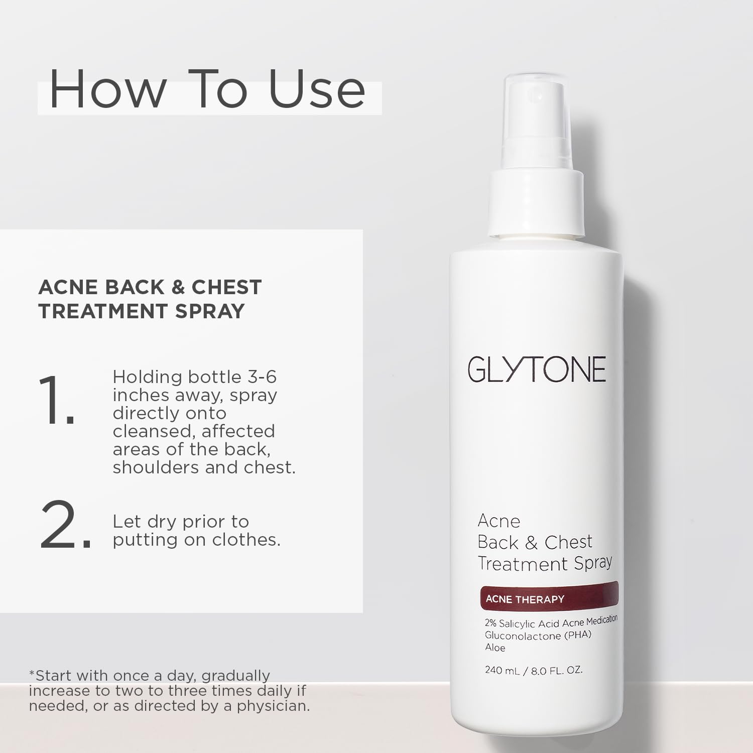 Glytone Chest & Back Acne Treatment Spray – 2% Bha Salicylic Acid With Gluconolactone – Body Acne Treatment For Bacne & Blackheads – Quick-Dry & Fragrance-Free Spray For Normal To Oily Skin – 8 Fl Oz